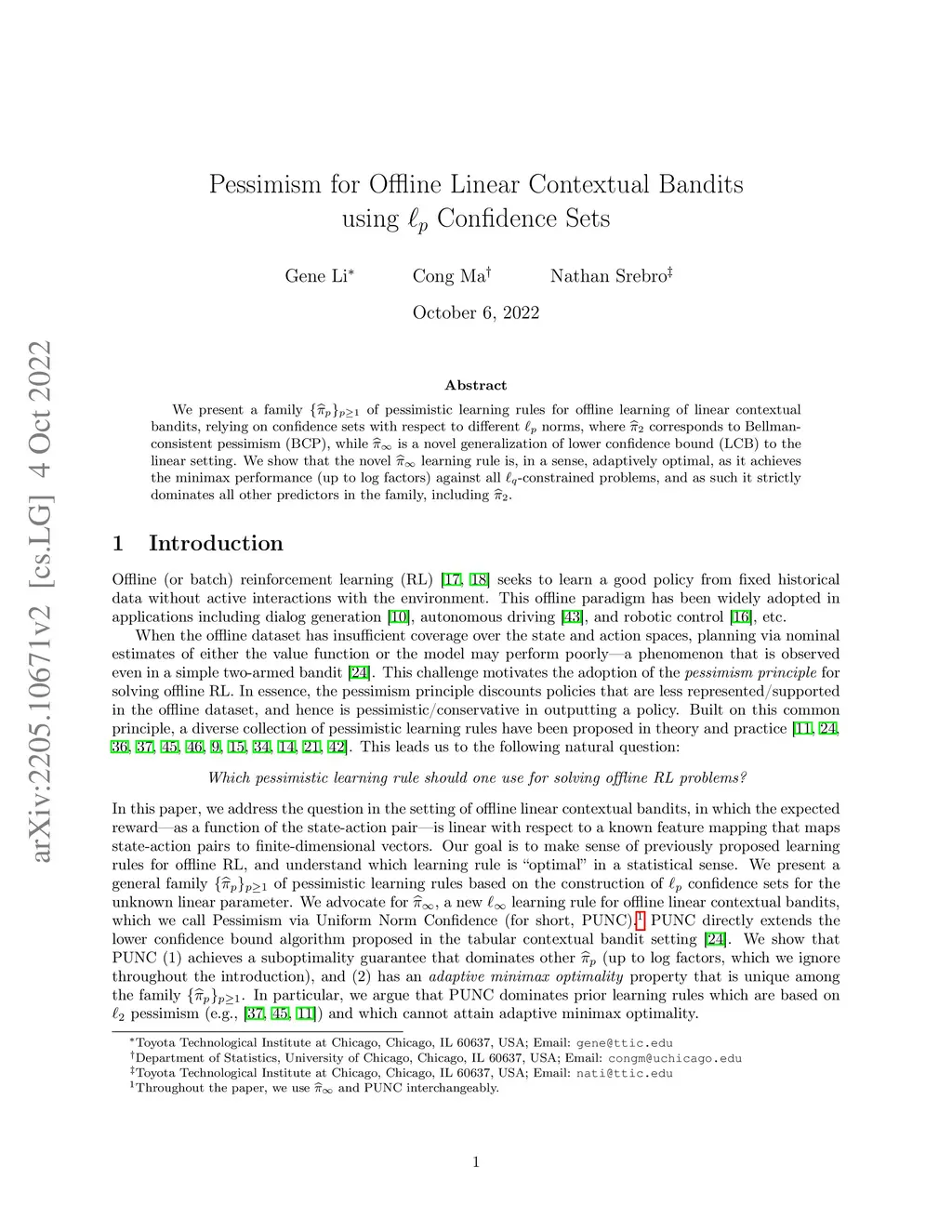 We present a family of pessimistic learning rules for offline learning of linear contextual bandits, relying on confidence sets with respect to different norms, where corresponds to Bellman-consistent pessimism (BCP), while is a novel generalization of lower confidence bound (LCB) to the linear setting. We show that the novel learning rule is, in a sense, adaptively optimal, as it achieves the minimax performance (up to log factors) against all -constrained problems, and as such it strictly dominates all other predictors in the family, including .