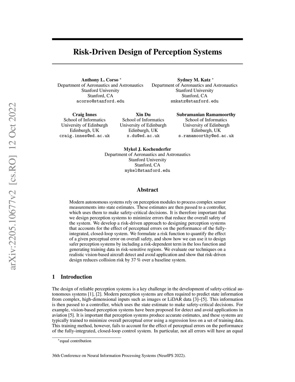 Modern autonomous systems rely on perception modules to process complex sensor measurements into state estimates. These estimates are then passed to a controller, which uses them to make safety-critical decisions. It is therefore important that we design perception systems to minimize errors that reduce the overall safety of the system. We develop a risk-driven approach to designing perception systems that accounts for the effect of perceptual errors on the performance of the fully-integrated, closed-loop system. We formulate a risk function to quantify the effect of a given perceptual error on overall safety, and show how we can use it to design safer perception systems by including a risk-dependent term in the loss function and generating training data in risk-sensitive regions. We evaluate our techniques on a realistic vision-based aircraft detect and avoid application and show that risk-driven design reduces collision risk by 37% over a baseline system.