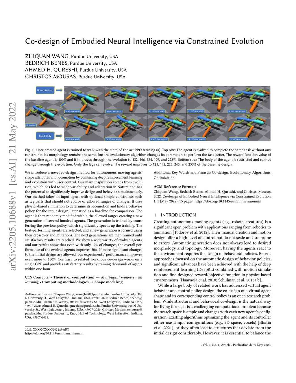 We introduce a novel co-design method for autonomous moving agents' shape attributes and locomotion by combining deep reinforcement learning and evolution with user control. Our main inspiration comes from evolution, which has led to wide variability and adaptation in Nature and has the potential to significantly improve design and behavior simultaneously. Our method takes an input agent with optional simple constraints such as leg parts that should not evolve or allowed ranges of changes. It uses physics-based simulation to determine its locomotion and finds a behavior policy for the input design, later used as a baseline for comparison. The agent is then randomly modified within the allowed ranges creating a new generation of several hundred agents. The generation is trained by transferring the previous policy, which significantly speeds up the training. The best-performing agents are selected, and a new generation is formed using their crossover and mutations. The next generations are then trained until satisfactory results are reached. We show a wide variety of evolved agents, and our results show that even with only 10% of changes, the overall performance of the evolved agents improves 50%. If more significant changes to the initial design are allowed, our experiments' performance improves even more to 150%. Contrary to related work, our co-design works on a single GPU and provides satisfactory results by training thousands of agents within one hour.