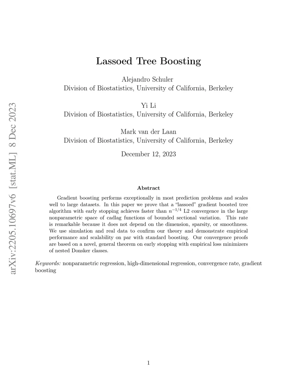 Gradient boosting performs exceptionally in most prediction problems and scales well to large datasets. In this paper we prove that a ``lassoed'' gradient boosted tree algorithm with early stopping achieves faster than L2 convergence in the large nonparametric space of cadlag functions of bounded sectional variation. This rate is remarkable because it does not depend on the dimension, sparsity, or smoothness. We use simulation and real data to confirm our theory and demonstrate empirical performance and scalability on par with standard boosting. Our convergence proofs are based on a novel, general theorem on early stopping with empirical loss minimizers of nested Donsker classes.