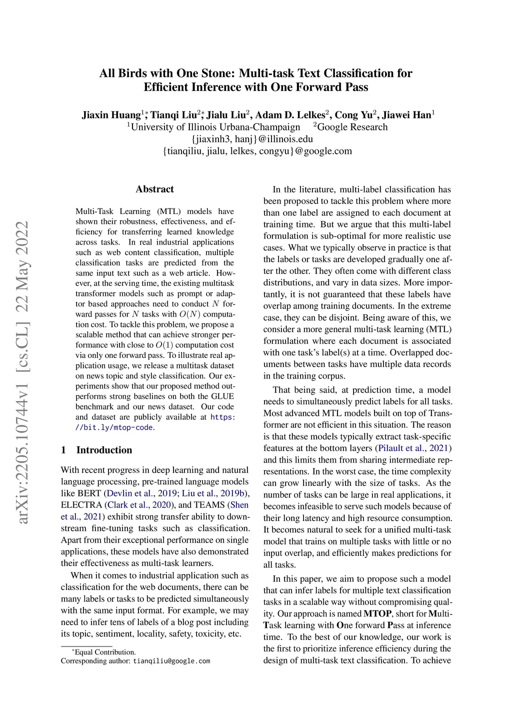 Multi-Task Learning (MTL) models have shown their robustness, effectiveness, and efficiency for transferring learned knowledge across tasks. In real industrial applications such as web content classification, multiple classification tasks are predicted from the same input text such as a web article. However, at the serving time, the existing multitask transformer models such as prompt or adaptor based approaches need to conduct N forward passes for N tasks with O(N) computation cost. To tackle this problem, we propose a scalable method that can achieve stronger performance with close to O(1) computation cost via only one forward pass. To illustrate real application usage, we release a multitask dataset on news topic and style classification. Our experiments show that our proposed method outperforms strong baselines on both the GLUE benchmark and our news dataset. Our code and dataset are publicly available at https://bit.ly/mtop-code.