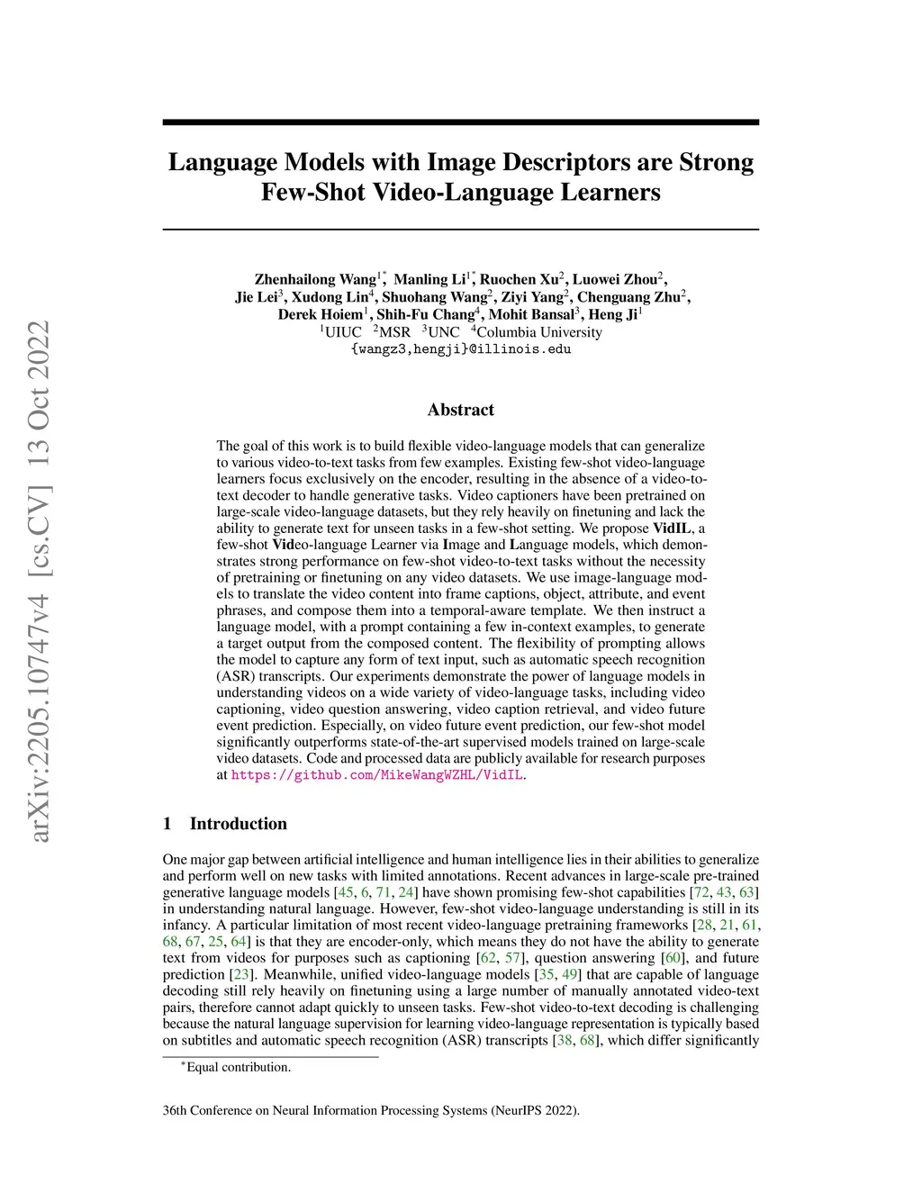 The goal of this work is to build flexible video-language models that can generalize to various video-to-text tasks from few examples, such as domain-specific captioning, question answering, and future event prediction. Existing few-shot video-language learners focus exclusively on the encoder, resulting in the absence of a video-to-text decoder to handle generative tasks. Video captioners have been pretrained on large-scale video-language datasets, but they rely heavily on finetuning and lack the ability to generate text for unseen tasks in a few-shot setting. We propose VidIL, a few-shot Video-language Learner via Image and Language models, which demonstrates strong performance on few-shot video-to-text tasks without the necessity of pretraining or finetuning on any video datasets. We use the image-language models to translate the video content into frame captions, object, attribute, and event phrases, and compose them into a temporal structure template. We then instruct a language model, with a prompt containing a few in-context examples, to generate a target output from the composed content. The flexibility of prompting allows the model to capture any form of text input, such as automatic speech recognition (ASR) transcripts. Our experiments demonstrate the power of language models in understanding videos on a wide variety of video-language tasks, including video captioning, video question answering, video caption retrieval, and video future event prediction. Especially, on video future event prediction, our few-shot model significantly outperforms state-of-the-art supervised models trained on large-scale video datasets. Code and resources are publicly available for research purposes at https://github.com/MikeWangWZHL/VidIL .