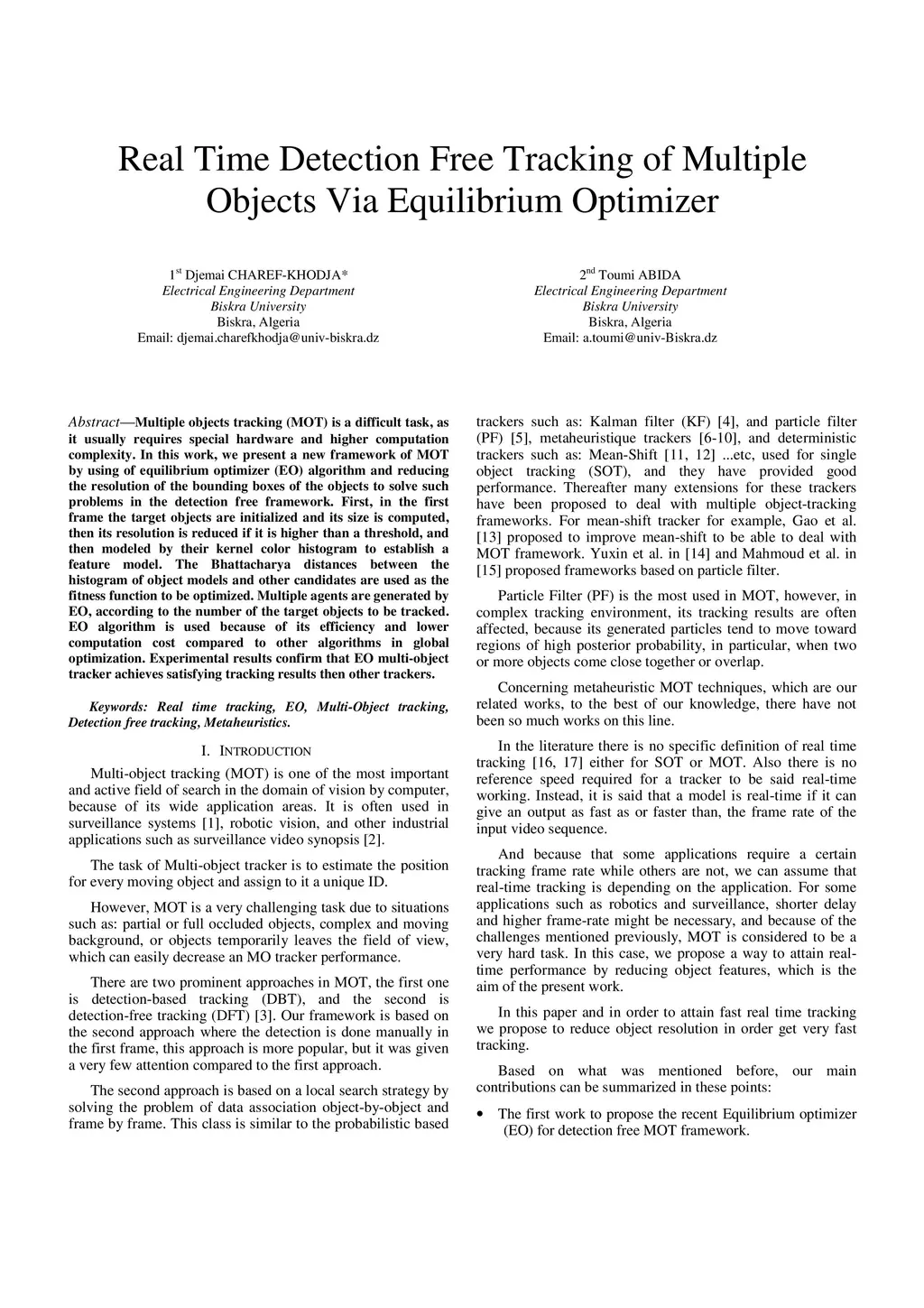 Multiple objects tracking (MOT) is a difficult task, as it usually requires special hardware and higher computation complexity. In this work, we present a new framework of MOT by using of equilibrium optimizer (EO) algorithm and reducing the resolution of the bounding boxes of the objects to solve such problems in the detection free framework. First, in the first frame the target objects are initialized and its size is computed, then its resolution is reduced if it is higher than a threshold, and then modeled by their kernel color histogram to establish a feature model. The Bhattacharya distances between the histogram of object models and other candidates are used as the fitness function to be optimized. Multiple agents are generated by EO, according to the number of the target objects to be tracked. EO algorithm is used because of its efficiency and lower computation cost compared to other algorithms in global optimization. Experimental results confirm that EO multi-object tracker achieves satisfying tracking results then other trackers.