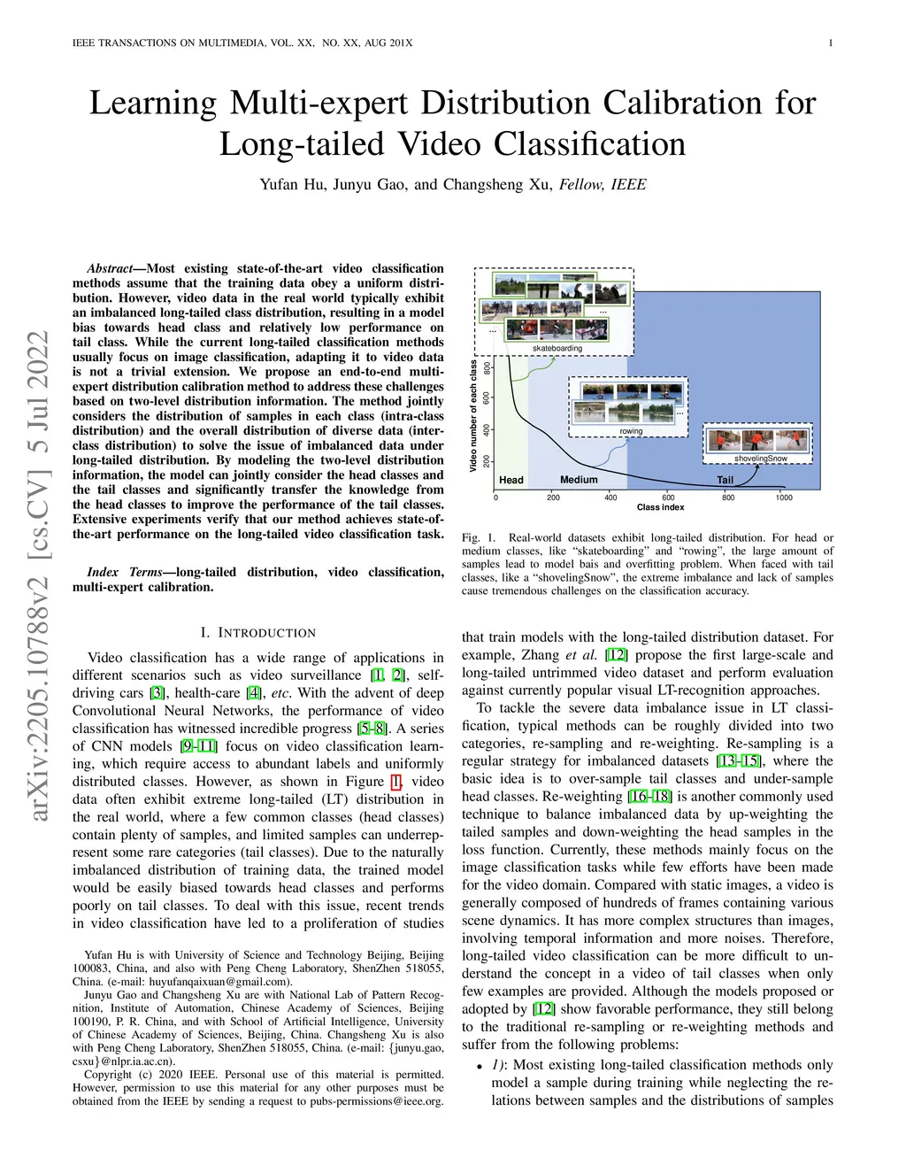 Most existing state-of-the-art video classification methods assume the training data obey a uniform distribution. However, video data in the real world typically exhibit long-tail class distribution and imbalance, which extensively results in a model bias towards head class and leads to relatively low performance on tail class. While the current long-tail classification methods usually focus on image classification, adapting it to video data is not a trivial extension. We propose an end-to-end multi-experts distribution calibration method based on two-level distribution information to address these challenges. The method jointly considers the distribution of samples in each class (intra-class distribution) and the diverse distributions of overall data (inter-class distribution) to solve the problem of imbalanced data under long-tailed distribution. By modeling this two-level distribution information, the model can consider the head classes and the tail classes and significantly transfer the knowledge from the head classes to improve the performance of the tail classes. Extensive experiments verify that our method achieves state-of-the-art performance on the long-tailed video classification task.