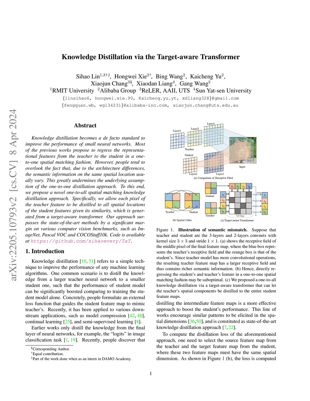 Knowledge distillation becomes a de facto standard to improve the performance of small neural networks. Most of the previous works propose to regress the representational features from the teacher to the student in a one-to-one spatial matching fashion. However, people tend to overlook the fact that, due to the architecture differences, the semantic information on the same spatial location usually vary. This greatly undermines the underlying assumption of the one-to-one distillation approach. To this end, we propose a novel one-to-all spatial matching knowledge distillation approach. Specifically, we allow each pixel of the teacher feature to be distilled to all spatial locations of the student features given its similarity, which is generated from a target-aware transformer. Our approach surpasses the state-of-the-art methods by a significant margin on various computer vision benchmarks, such as ImageNet, Pascal VOC and COCOStuff10k. Code is available at https://github.com/sihaoevery/TaT.