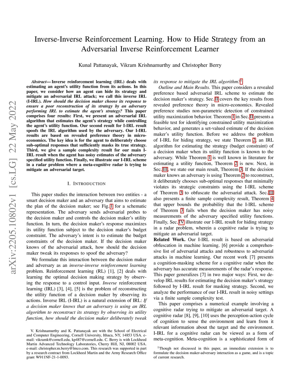 Inverse reinforcement learning (IRL) deals with estimating an agent's utility function from its actions. In this paper, we consider how an agent can hide its strategy and mitigate an adversarial IRL attack; we call this inverse IRL (I-IRL). How should the decision maker choose its response to ensure a poor reconstruction of its strategy by an adversary performing IRL to estimate the agent's strategy? This paper comprises four results: First, we present an adversarial IRL algorithm that estimates the agent's strategy while controlling the agent's utility function. Our second result for I-IRL result spoofs the IRL algorithm used by the adversary. Our I-IRL results are based on revealed preference theory in micro-economics. The key idea is for the agent to deliberately choose sub-optimal responses that sufficiently masks its true strategy. Third, we give a sample complexity result for our main I-IRL result when the agent has noisy estimates of the adversary specified utility function. Finally, we illustrate our I-IRL scheme in a radar problem where a meta-cognitive radar is trying to mitigate an adversarial target.