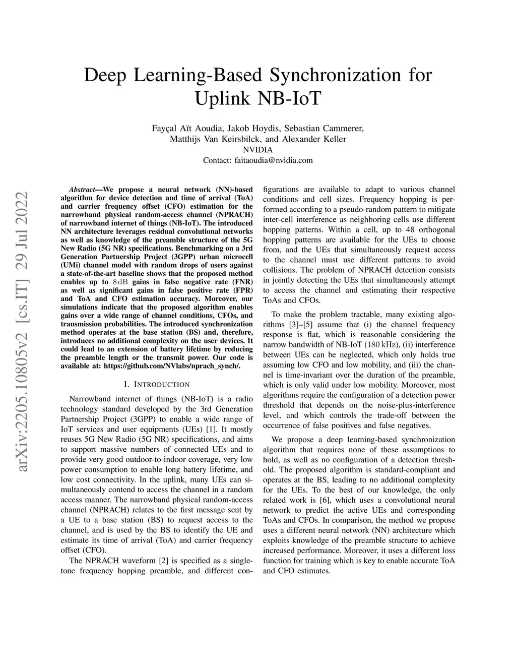 We propose a neural network (NN)-based algorithm for device detection and time of arrival (ToA) and carrier frequency offset (CFO) estimation for the narrowband physical random-access channel (NPRACH) of narrowband internet of things (NB-IoT). The introduced NN architecture leverages residual convolutional networks as well as knowledge of the preamble structure of the 5G New Radio (5G NR) specifications. Benchmarking on a 3rd Generation Partnership Project (3GPP) urban microcell (UMi) channel model with random drops of users against a state-of-the-art baseline shows that the proposed method enables up to 8 dB gains in false negative rate (FNR) as well as significant gains in false positive rate (FPR) and ToA and CFO estimation accuracy. Moreover, our simulations indicate that the proposed algorithm enables gains over a wide range of channel conditions, CFOs, and transmission probabilities. The introduced synchronization method operates at the base station (BS) and, therefore, introduces no additional complexity on the user devices. It could lead to an extension of battery lifetime by reducing the preamble length or the transmit power. Our code is available at: https://github.com/NVlabs/nprach_synch/.