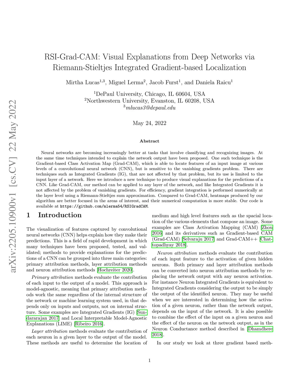 Neural networks are becoming increasingly better at tasks that involve classifying and recognizing images. At the same time techniques intended to explain the network output have been proposed. One such technique is the Gradient-based Class Activation Map (Grad-CAM), which is able to locate features of an input image at various levels of a convolutional neural network (CNN), but is sensitive to the vanishing gradients problem. There are techniques such as Integrated Gradients (IG), that are not affected by that problem, but its use is limited to the input layer of a network. Here we introduce a new technique to produce visual explanations for the predictions of a CNN. Like Grad-CAM, our method can be applied to any layer of the network, and like Integrated Gradients it is not affected by the problem of vanishing gradients. For efficiency, gradient integration is performed numerically at the layer level using a Riemann-Stieltjes sum approximation. Compared to Grad-CAM, heatmaps produced by our algorithm are better focused in the areas of interest, and their numerical computation is more stable. Our code is available at https://github.com/mlerma54/RSIGradCAM