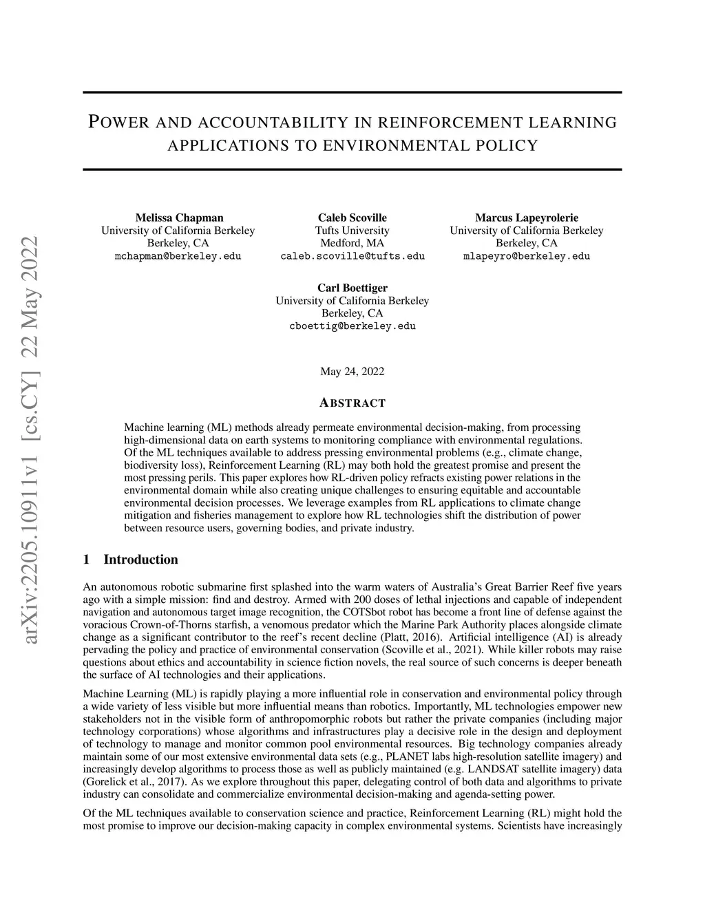 Machine learning (ML) methods already permeate environmental decision-making, from processing high-dimensional data on earth systems to monitoring compliance with environmental regulations. Of the ML techniques available to address pressing environmental problems (e.g., climate change, biodiversity loss), Reinforcement Learning (RL) may both hold the greatest promise and present the most pressing perils. This paper explores how RL-driven policy refracts existing power relations in the environmental domain while also creating unique challenges to ensuring equitable and accountable environmental decision processes. We leverage examples from RL applications to climate change mitigation and fisheries management to explore how RL technologies shift the distribution of power between resource users, governing bodies, and private industry.