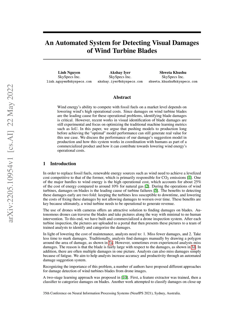 Wind energy's ability to compete with fossil fuels on a market level depends on lowering wind's high operational costs. Since damages on wind turbine blades are the leading cause for these operational problems, identifying blade damages is critical. However, recent works in visual identification of blade damages are still experimental and focus on optimizing the traditional machine learning metrics such as IoU. In this paper, we argue that pushing models to production long before achieving the "optimal" model performance can still generate real value for this use case. We discuss the performance of our damage's suggestion model in production and how this system works in coordination with humans as part of a commercialized product and how it can contribute towards lowering wind energy's operational costs.