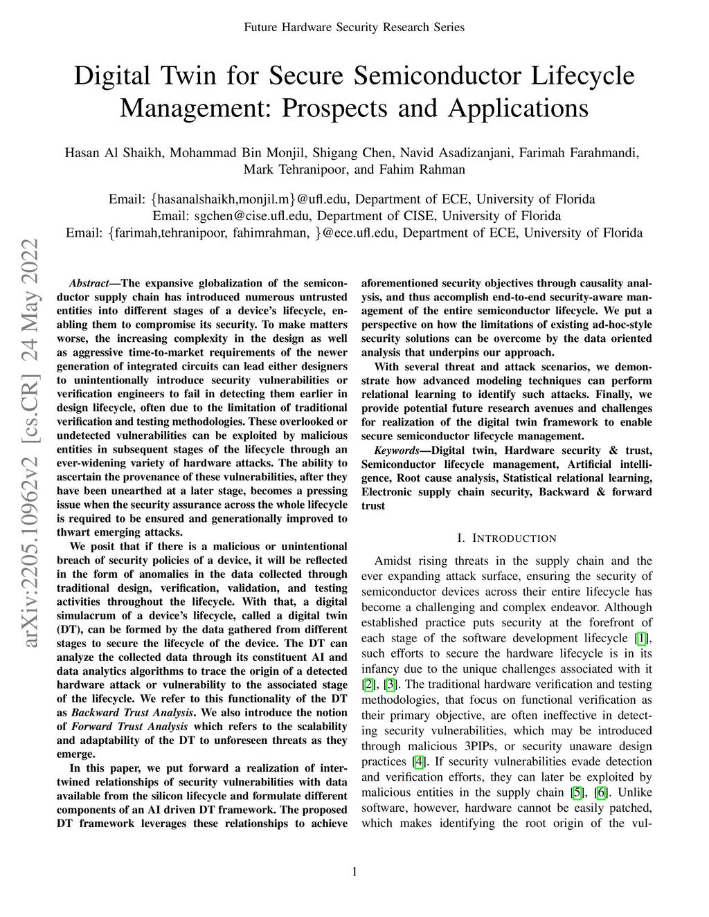 The expansive globalization of the semiconductor supply chain has introduced numerous untrusted entities into different stages of a device's lifecycle. To make matters worse, the increase complexity in the design as well as aggressive time to market requirements of the newer generation of integrated circuits can lead either designers to unintentionally introduce security vulnerabilities or verification engineers to fail in detecting them earlier in the design lifecycle. These overlooked or undetected vulnerabilities can be exploited by malicious entities in subsequent stages of the lifecycle through an ever widening variety of hardware attacks. The ability to ascertain the provenance of these vulnerabilities, therefore, becomes a pressing issue when the security assurance across the whole lifecycle is required to be ensured. We posit that if there is a malicious or unintentional breach of security policies of a device, it will be reflected in the form of anomalies in the traditional design, verification and testing activities throughout the lifecycle. With that, a digital simulacrum of a device's lifecycle, called a digital twin (DT), can be formed by the data gathered from different stages to secure the lifecycle of the device. In this paper, we put forward a realization of intertwined relationships of security vulnerabilities with data available from the silicon lifecycle and formulate different components of an AI driven DT framework. The proposed DT framework leverages these relationships and relational learning to achieve Forward and Backward Trust Analysis functionalities enabling security aware management of the entire lifecycle. Finally, we provide potential future research avenues and challenges for realization of the digital twin framework to enable secure semiconductor lifecycle management.