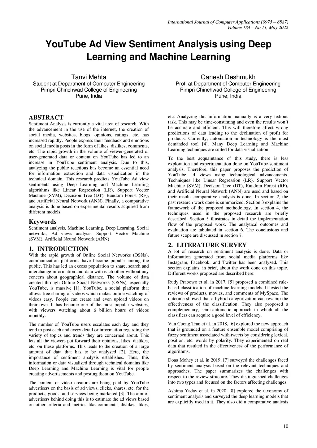 YouTube Ad View Sentiment Analysis using Deep Learning and Machine