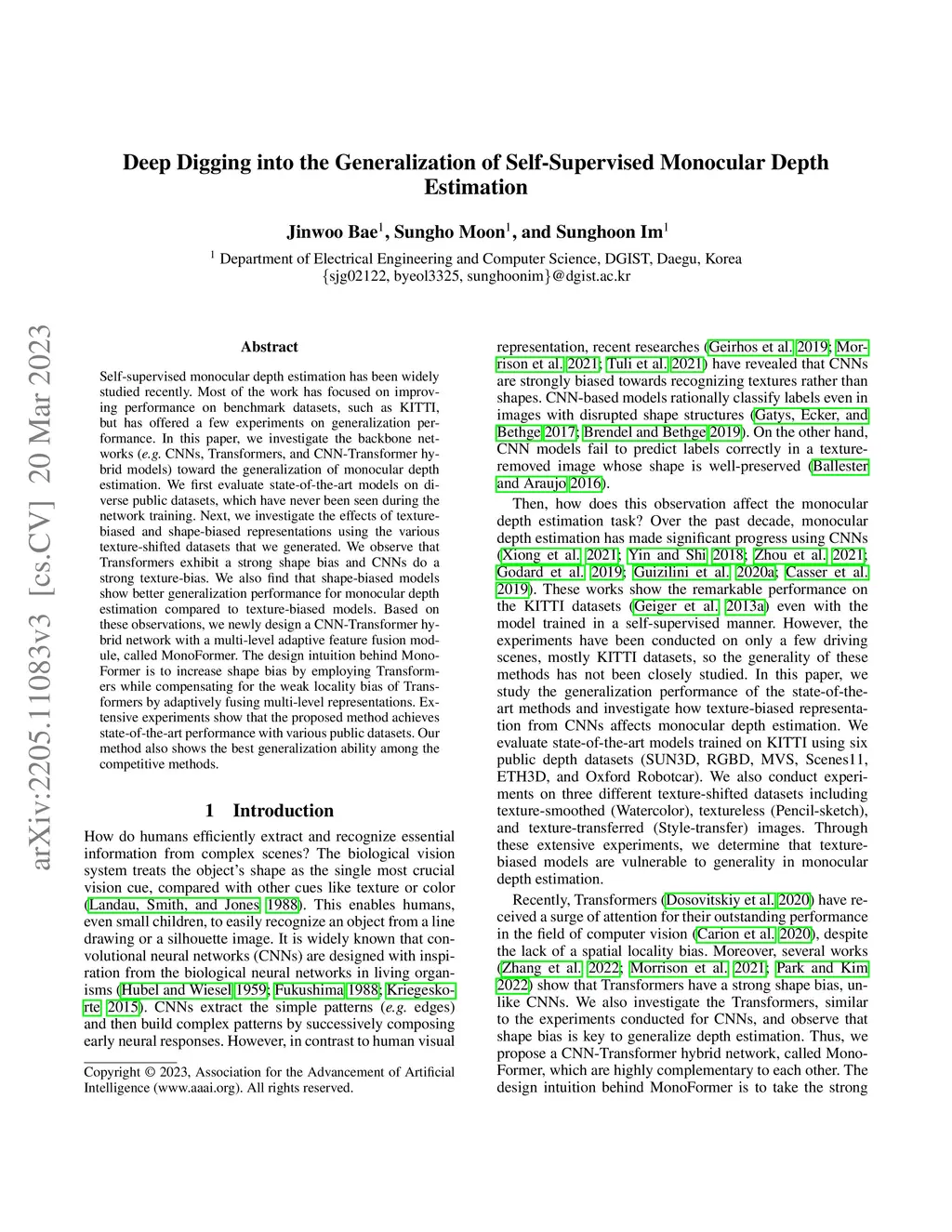 Self-supervised monocular depth estimation has been widely studied recently. Most of the work has focused on improving performance on benchmark datasets, such as KITTI, but has offered a few experiments on generalization performance. In this paper, we investigate the backbone networks (e.g. CNNs, Transformers, and CNN-Transformer hybrid models) toward the generalization of monocular depth estimation. We first evaluate state-of-the-art models on diverse public datasets, which have never been seen during the network training. Next, we investigate the effects of texture-biased and shape-biased representations using the various texture-shifted datasets that we generated. We observe that Transformers exhibit a strong shape bias and CNNs do a strong texture-bias. We also find that shape-biased models show better generalization performance for monocular depth estimation compared to texture-biased models. Based on these observations, we newly design a CNN-Transformer hybrid network with a multi-level adaptive feature fusion module, called MonoFormer. The design intuition behind MonoFormer is to increase shape bias by employing Transformers while compensating for the weak locality bias of Transformers by adaptively fusing multi-level representations. Extensive experiments show that the proposed method achieves state-of-the-art performance with various public datasets. Our method also shows the best generalization ability among the competitive methods.