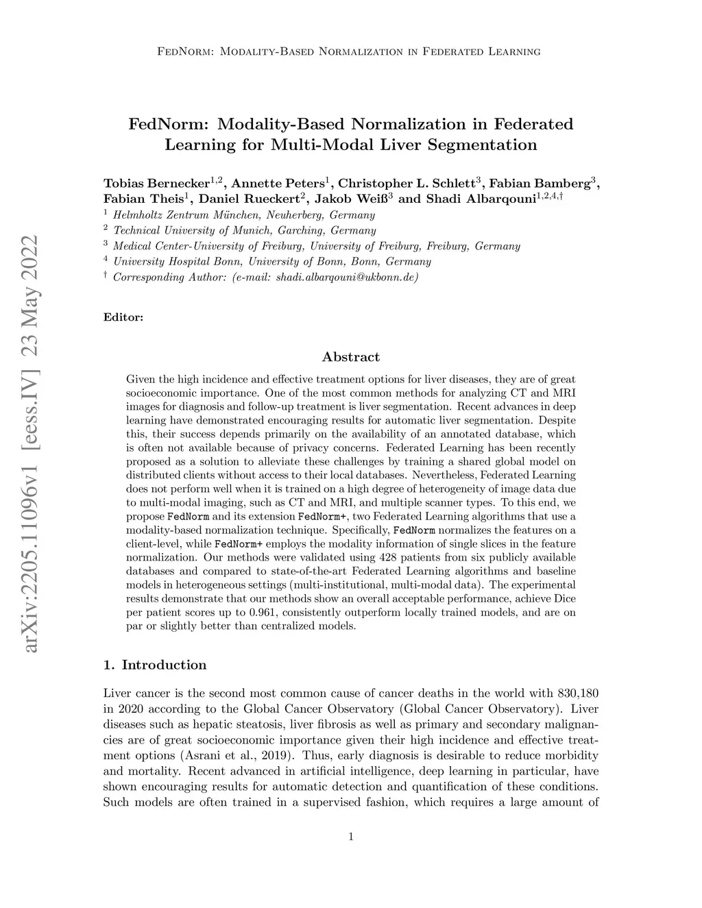 Given the high incidence and effective treatment options for liver diseases, they are of great socioeconomic importance. One of the most common methods for analyzing CT and MRI images for diagnosis and follow-up treatment is liver segmentation. Recent advances in deep learning have demonstrated encouraging results for automatic liver segmentation. Despite this, their success depends primarily on the availability of an annotated database, which is often not available because of privacy concerns. Federated Learning has been recently proposed as a solution to alleviate these challenges by training a shared global model on distributed clients without access to their local databases. Nevertheless, Federated Learning does not perform well when it is trained on a high degree of heterogeneity of image data due to multi-modal imaging, such as CT and MRI, and multiple scanner types. To this end, we propose Fednorm and its extension \fednormp, two Federated Learning algorithms that use a modality-based normalization technique. Specifically, Fednorm normalizes the features on a client-level, while Fednorm+ employs the modality information of single slices in the feature normalization. Our methods were validated using 428 patients from six publicly available databases and compared to state-of-the-art Federated Learning algorithms and baseline models in heterogeneous settings (multi-institutional, multi-modal data). The experimental results demonstrate that our methods show an overall acceptable performance, achieve Dice per patient scores up to 0.961, consistently outperform locally trained models, and are on par or slightly better than centralized models.