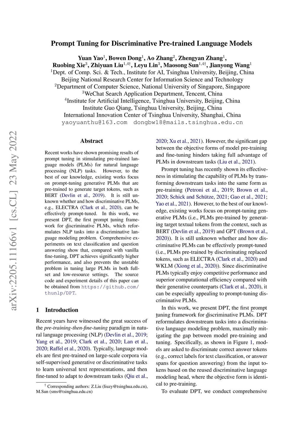 Recent works have shown promising results of prompt tuning in stimulating pre-trained language models (PLMs) for natural language processing (NLP) tasks. However, to the best of our knowledge, existing works focus on prompt-tuning generative PLMs that are pre-trained to generate target tokens, such as BERT. It is still unknown whether and how discriminative PLMs, e.g., ELECTRA, can be effectively prompt-tuned. In this work, we present DPT, the first prompt tuning framework for discriminative PLMs, which reformulates NLP tasks into a discriminative language modeling problem. Comprehensive experiments on text classification and question answering show that, compared with vanilla fine-tuning, DPT achieves significantly higher performance, and also prevents the unstable problem in tuning large PLMs in both full-set and low-resource settings. The source code and experiment details of this paper can be obtained from https://github.com/thunlp/DPT.