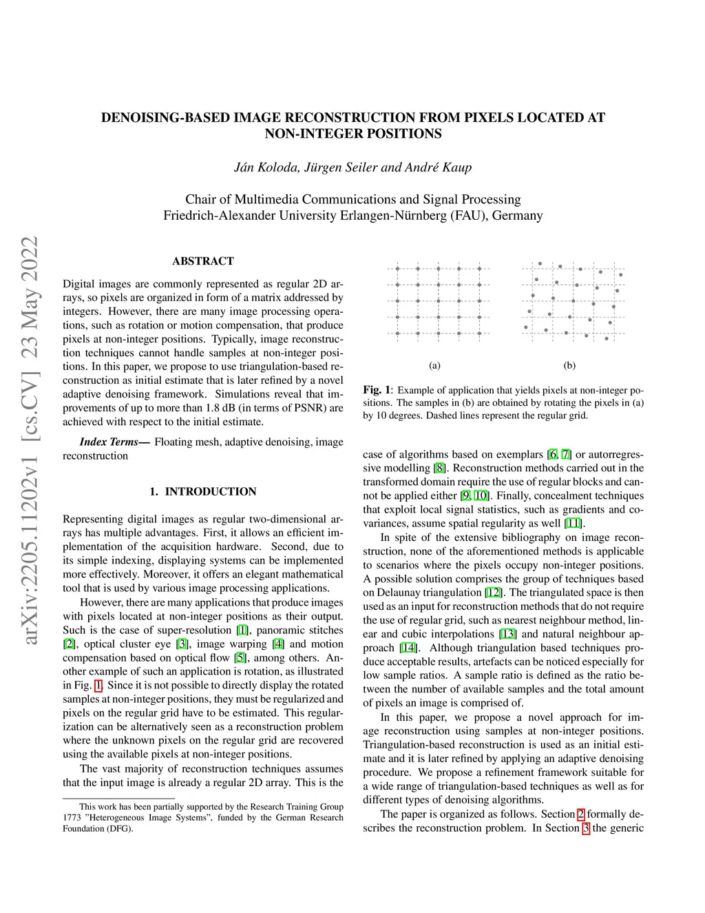 Digital images are commonly represented as regular 2D arrays, so pixels are organized in form of a matrix addressed by integers. However, there are many image processing operations, such as rotation or motion compensation, that produce pixels at non-integer positions. Typically, image reconstruction techniques cannot handle samples at non-integer positions. In this paper, we propose to use triangulation-based reconstruction as initial estimate that is later refined by a novel adaptive denoising framework. Simulations reveal that improvements of up to more than 1.8 dB (in terms of PSNR) are achieved with respect to the initial estimate.