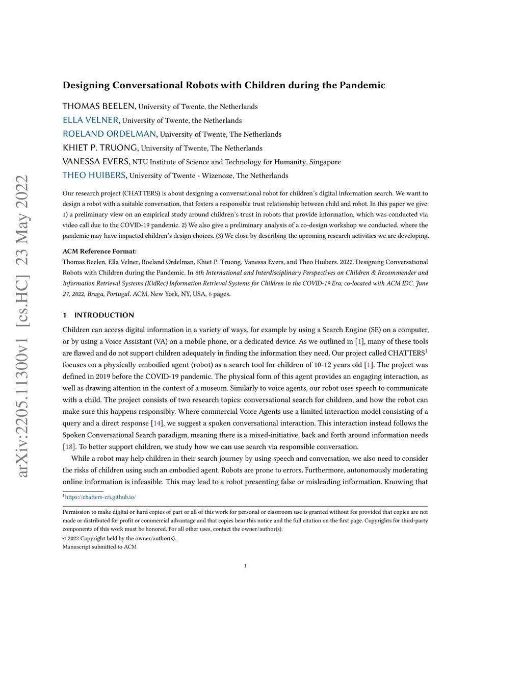 Our research project (CHATTERS) is about designing a conversational robot for children's digital information search. We want to design a robot with a suitable conversation, that fosters a responsible trust relationship between child and robot. In this paper we give: 1) a preliminary view on an empirical study around children's trust in robots that provide information, which was conducted via video call due to the COVID-19 pandemic. 2) We also give a preliminary analysis of a co-design workshop we conducted, where the pandemic may have impacted children's design choices. (3) We close by describing the upcoming research activities we are developing.