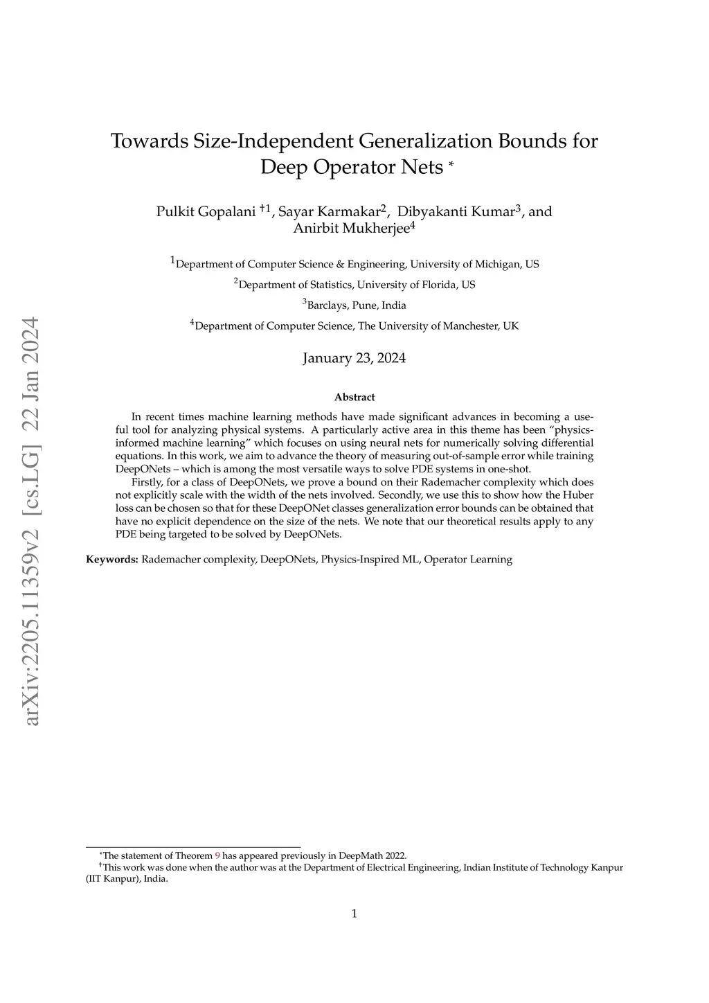 In recent times machine learning methods have made significant advances in becoming a useful tool for analyzing physical systems. A particularly active area in this theme has been "physics-informed machine learning" which focuses on using neural nets for numerically solving differential equations. In this work, we aim to advance the theory of measuring out-of-sample error while training DeepONets -- which is among the most versatile ways to solve PDE systems in one-shot. Firstly, for a class of DeepONets, we prove a bound on their Rademacher complexity which does not explicitly scale with the width of the nets involved. Secondly, we use this to show how the Huber loss can be chosen so that for these DeepONet classes generalization error bounds can be obtained that have no explicit dependence on the size of the nets. We note that our theoretical results apply to any PDE being targeted to be solved by DeepONets.