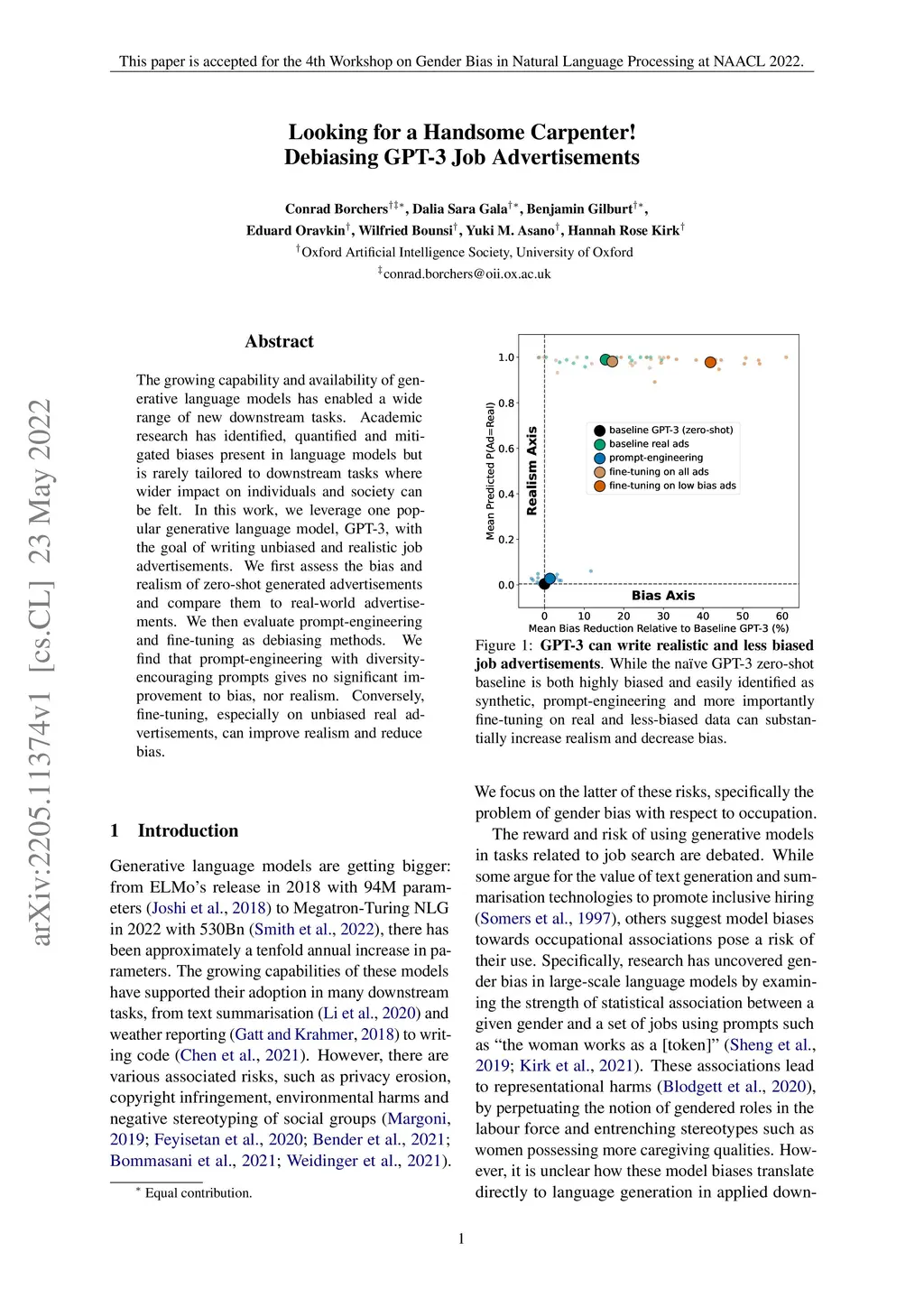 The growing capability and availability of generative language models has enabled a wide range of new downstream tasks. Academic research has identified, quantified and mitigated biases present in language models but is rarely tailored to downstream tasks where wider impact on individuals and society can be felt. In this work, we leverage one popular generative language model, GPT-3, with the goal of writing unbiased and realistic job advertisements. We first assess the bias and realism of zero-shot generated advertisements and compare them to real-world advertisements. We then evaluate prompt-engineering and fine-tuning as debiasing methods. We find that prompt-engineering with diversity-encouraging prompts gives no significant improvement to bias, nor realism. Conversely, fine-tuning, especially on unbiased real advertisements, can improve realism and reduce bias.