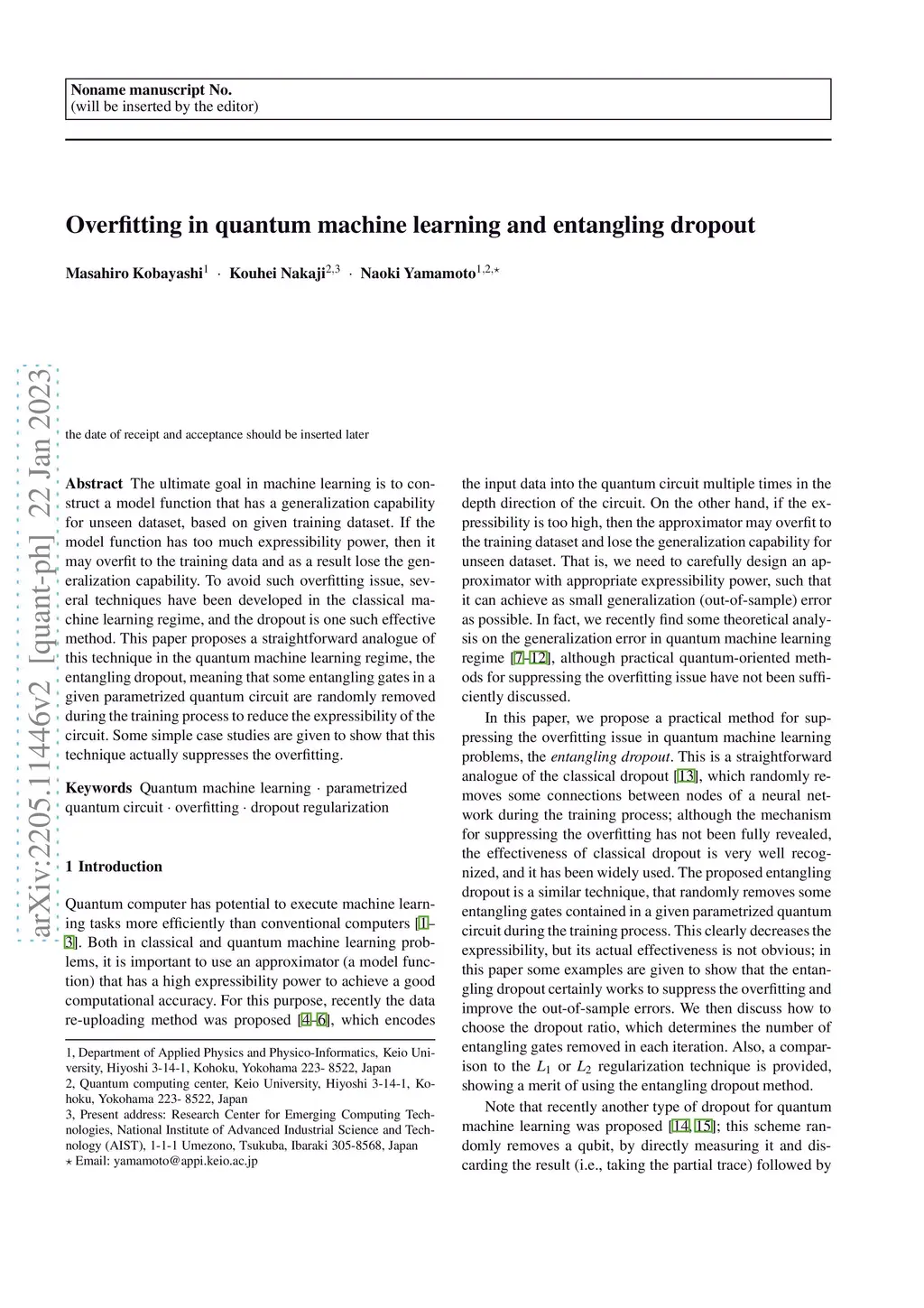 Overfitting in quantum machine learning and entangling dropout