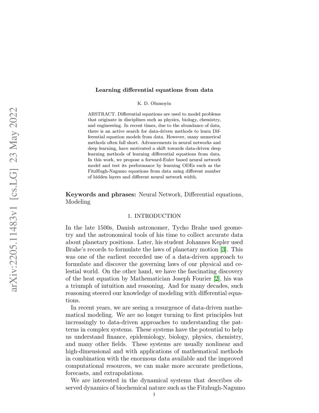 Differential equations are used to model problems that originate in disciplines such as physics, biology, chemistry, and engineering. In recent times, due to the abundance of data, there is an active search for data-driven methods to learn Differential equation models from data. However, many numerical methods often fall short. Advancements in neural networks and deep learning, have motivated a shift towards data-driven deep learning methods of learning differential equations from data. In this work, we propose a forward-Euler based neural network model and test its performance by learning ODEs such as the FitzHugh-Nagumo equations from data using different number of hidden layers and different neural network width.