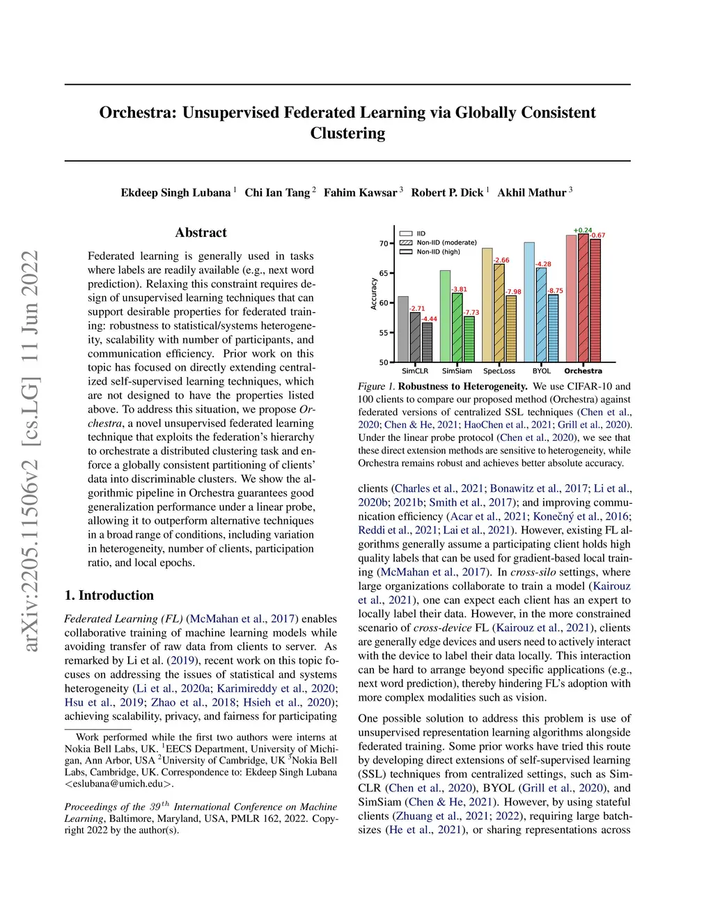Federated learning is generally used in tasks where labels are readily available (e.g., next word prediction). Relaxing this constraint requires design of unsupervised learning techniques that can support desirable properties for federated training: robustness to statistical/systems heterogeneity, scalability with number of participants, and communication efficiency. Prior work on this topic has focused on directly extending centralized self-supervised learning techniques, which are not designed to have the properties listed above. To address this situation, we propose Orchestra, a novel unsupervised federated learning technique that exploits the federation's hierarchy to orchestrate a distributed clustering task and enforce a globally consistent partitioning of clients' data into discriminable clusters. We show the algorithmic pipeline in Orchestra guarantees good generalization performance under a linear probe, allowing it to outperform alternative techniques in a broad range of conditions, including variation in heterogeneity, number of clients, participation ratio, and local epochs.