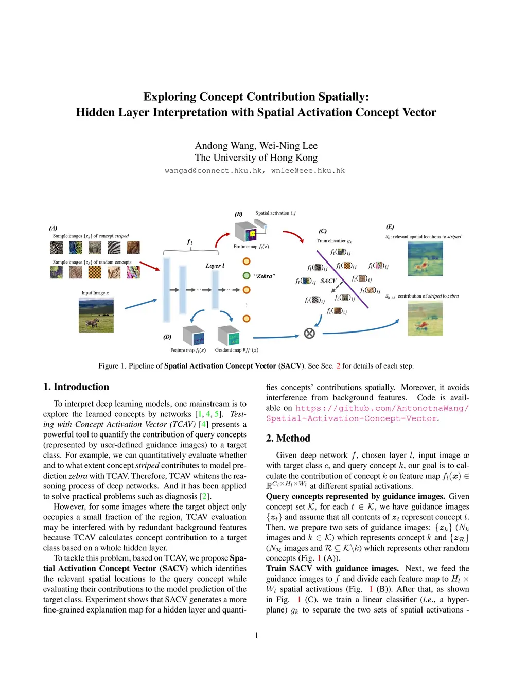 To interpret deep learning models, one mainstream is to explore the learned concepts by networks. Testing with Concept Activation Vector (TCAV) presents a powerful tool to quantify the contribution of query concepts (represented by user-defined guidance images) to a target class. For example, we can quantitatively evaluate whether and to what extent concept striped contributes to model prediction zebra with TCAV. Therefore, TCAV whitens the reasoning process of deep networks. And it has been applied to solve practical problems such as diagnosis. However, for some images where the target object only occupies a small fraction of the region, TCAV evaluation may be interfered with by redundant background features because TCAV calculates concept contribution to a target class based on a whole hidden layer. To tackle this problem, based on TCAV, we propose Spatial Activation Concept Vector (SACV) which identifies the relevant spatial locations to the query concept while evaluating their contributions to the model prediction of the target class. Experiment shows that SACV generates a more fine-grained explanation map for a hidden layer and quantifies concepts' contributions spatially. Moreover, it avoids interference from background features. The code is available on https://github.com/AntonotnaWang/Spatial-Activation-Concept-Vector.