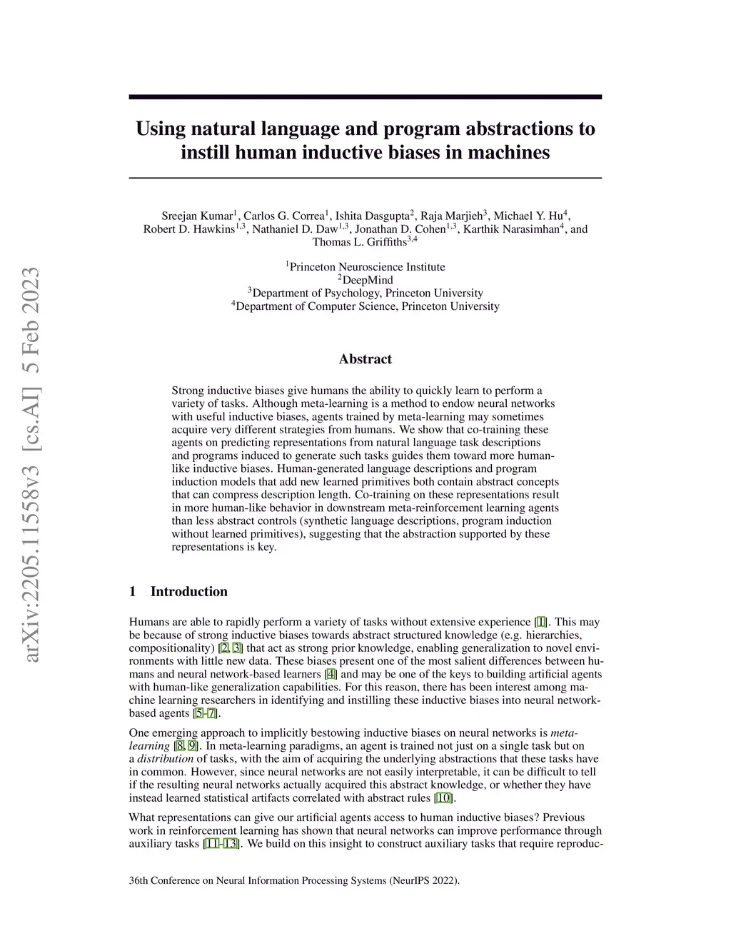 Strong inductive biases give humans the ability to quickly learn to perform a variety of tasks. Although meta-learning is a method to endow neural networks with useful inductive biases, agents trained by meta-learning may sometimes acquire very different strategies from humans. We show that co-training these agents on predicting representations from natural language task descriptions and programs induced to generate such tasks guides them toward more human-like inductive biases. Human-generated language descriptions and program induction models that add new learned primitives both contain abstract concepts that can compress description length. Co-training on these representations result in more human-like behavior in downstream meta-reinforcement learning agents than less abstract controls (synthetic language descriptions, program induction without learned primitives), suggesting that the abstraction supported by these representations is key.