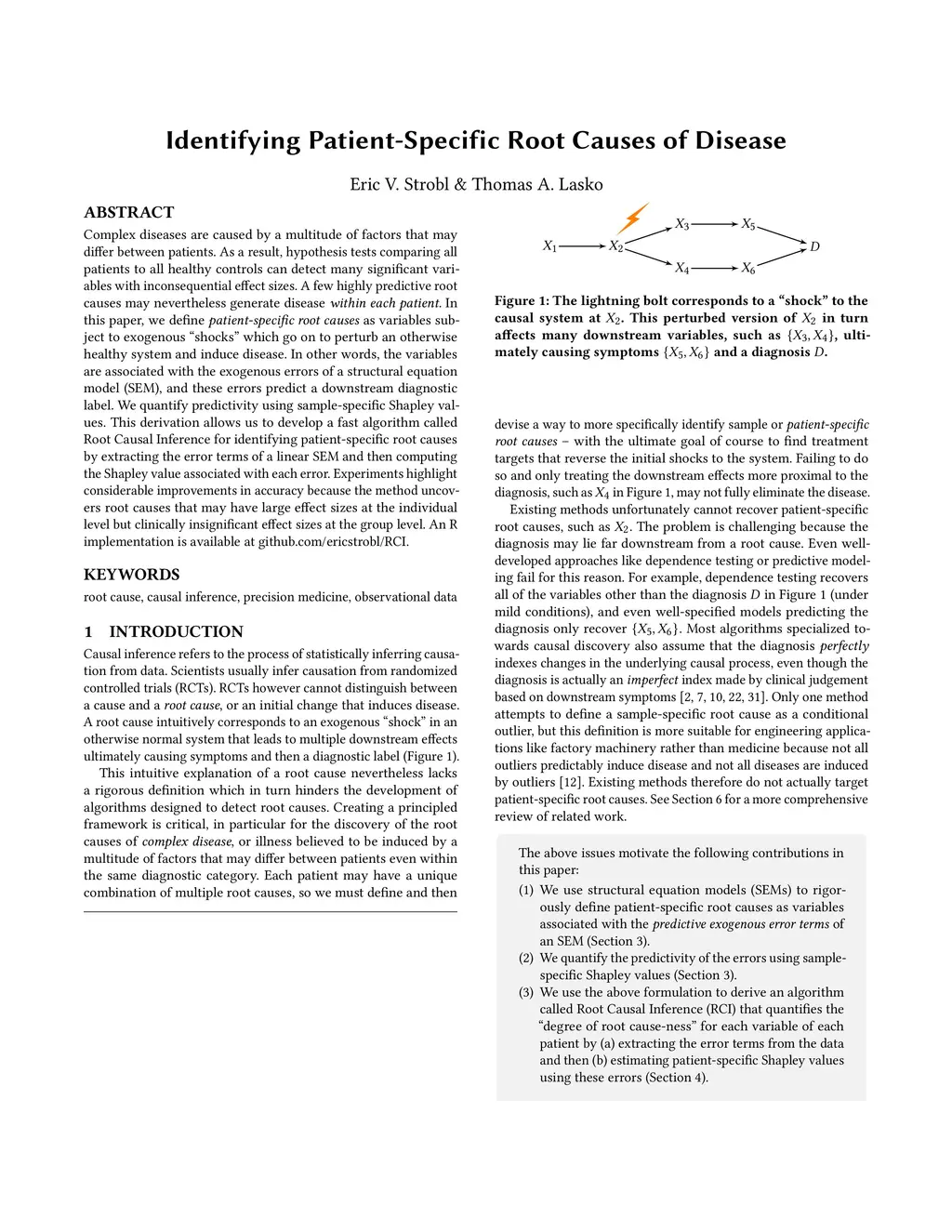 Complex diseases are caused by a multitude of factors that may differ between patients. As a result, hypothesis tests comparing all patients to all healthy controls can detect many significant variables with inconsequential effect sizes. A few highly predictive root causes may nevertheless generate disease within each patient. In this paper, we define patient-specific root causes as variables subject to exogenous "shocks" which go on to perturb an otherwise healthy system and induce disease. In other words, the variables are associated with the exogenous errors of a structural equation model (SEM), and these errors predict a downstream diagnostic label. We quantify predictivity using sample-specific Shapley values. This derivation allows us to develop a fast algorithm called Root Causal Inference for identifying patient-specific root causes by extracting the error terms of a linear SEM and then computing the Shapley value associated with each error. Experiments highlight considerable improvements in accuracy because the method uncovers root causes that may have large effect sizes at the individual level but clinically insignificant effect sizes at the group level. An R implementation is available at github.com/ericstrobl/RCI.