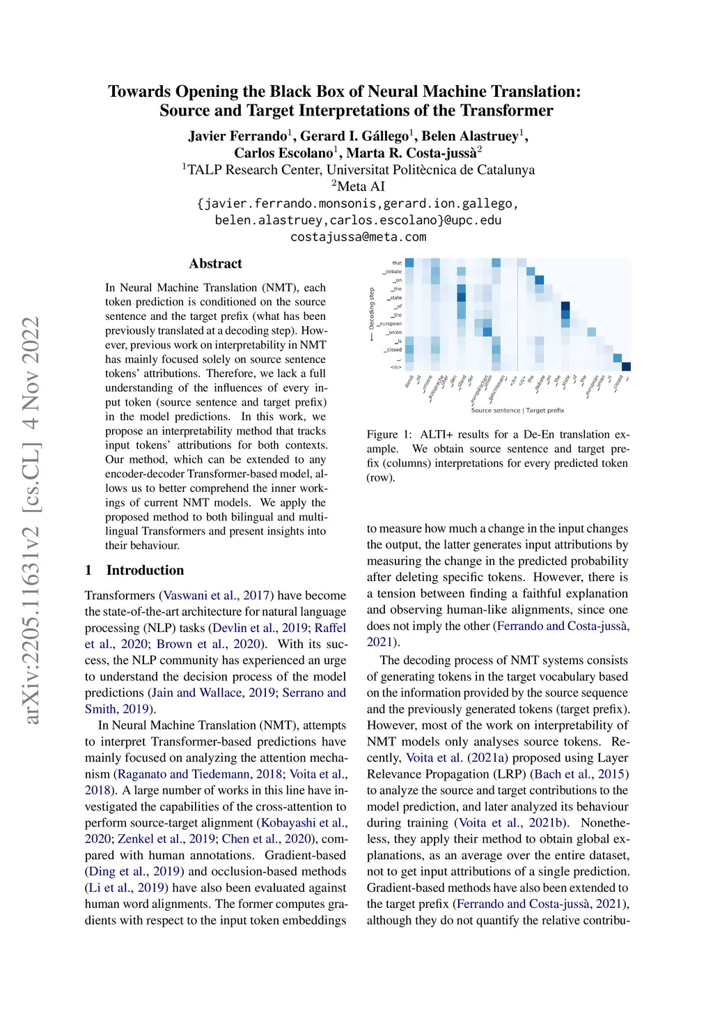 In Neural Machine Translation (NMT), each token prediction is conditioned on the source sentence and the target prefix (what has been previously translated at a decoding step). However, previous work on interpretability in NMT has mainly focused solely on source sentence tokens' attributions. Therefore, we lack a full understanding of the influences of every input token (source sentence and target prefix) in the model predictions. In this work, we propose an interpretability method that tracks input tokens' attributions for both contexts. Our method, which can be extended to any encoder-decoder Transformer-based model, allows us to better comprehend the inner workings of current NMT models. We apply the proposed method to both bilingual and multilingual Transformers and present insights into their behaviour.