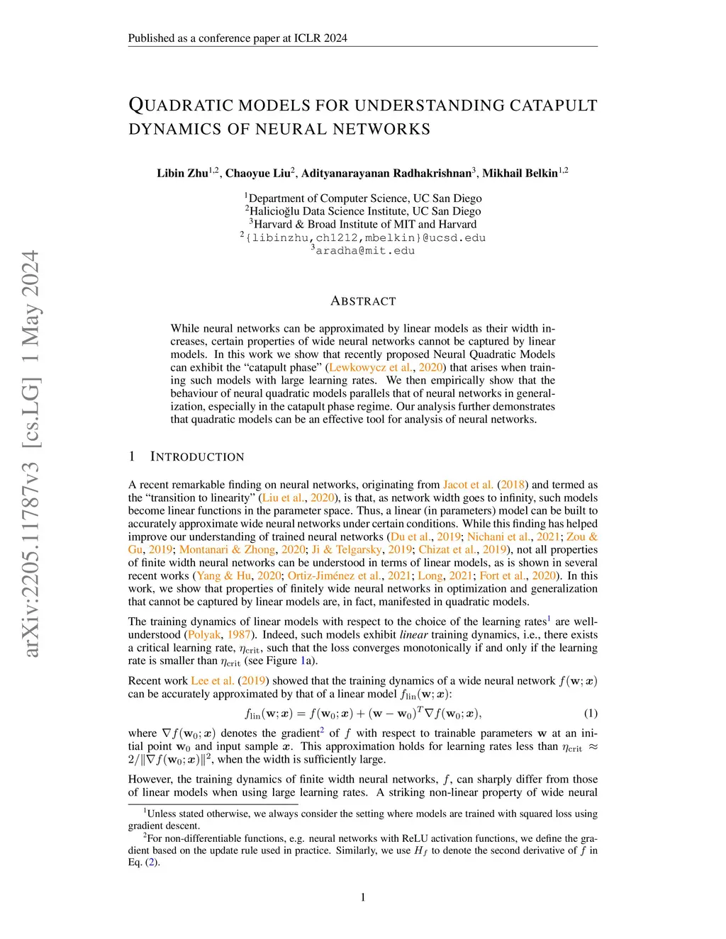 While neural networks can be approximated by linear models as their width increases, certain properties of wide neural networks cannot be captured by linear models. In this work we show that recently proposed Neural Quadratic Models can exhibit the "catapult phase" [Lewkowycz et al. 2020] that arises when training such models with large learning rates. We then empirically show that the behaviour of neural quadratic models parallels that of neural networks in generalization, especially in the catapult phase regime. Our analysis further demonstrates that quadratic models can be an effective tool for analysis of neural networks.