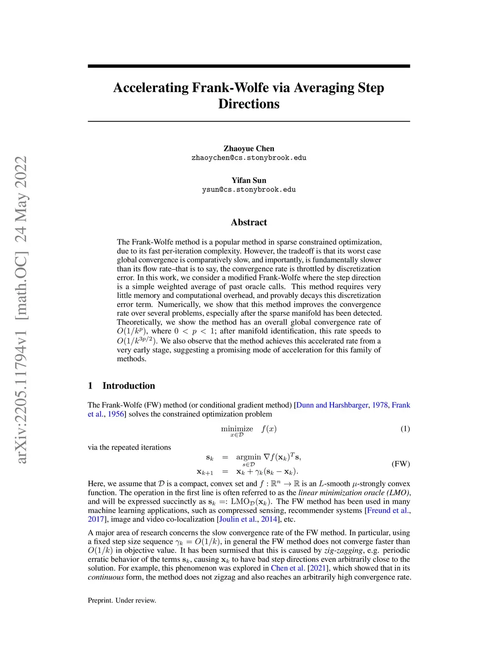 The Frank-Wolfe method is a popular method in sparse constrained optimization, due to its fast per-iteration complexity. However, the tradeoff is that its worst case global convergence is comparatively slow, and importantly, is fundamentally slower than its flow rate--that is to say, the convergence rate is throttled by discretization error. In this work, we consider a modified Frank-Wolfe where the step direction is a simple weighted average of past oracle calls. This method requires very little memory and computational overhead, and provably decays this discretization error term. Numerically, we show that this method improves the convergence rate over several problems, especially after the sparse manifold has been detected. Theoretically, we show the method has an overall global convergence rate of , where ; after manifold identification, this rate speeds to . We also observe that the method achieves this accelerated rate from a very early stage, suggesting a promising mode of acceleration for this family of methods.