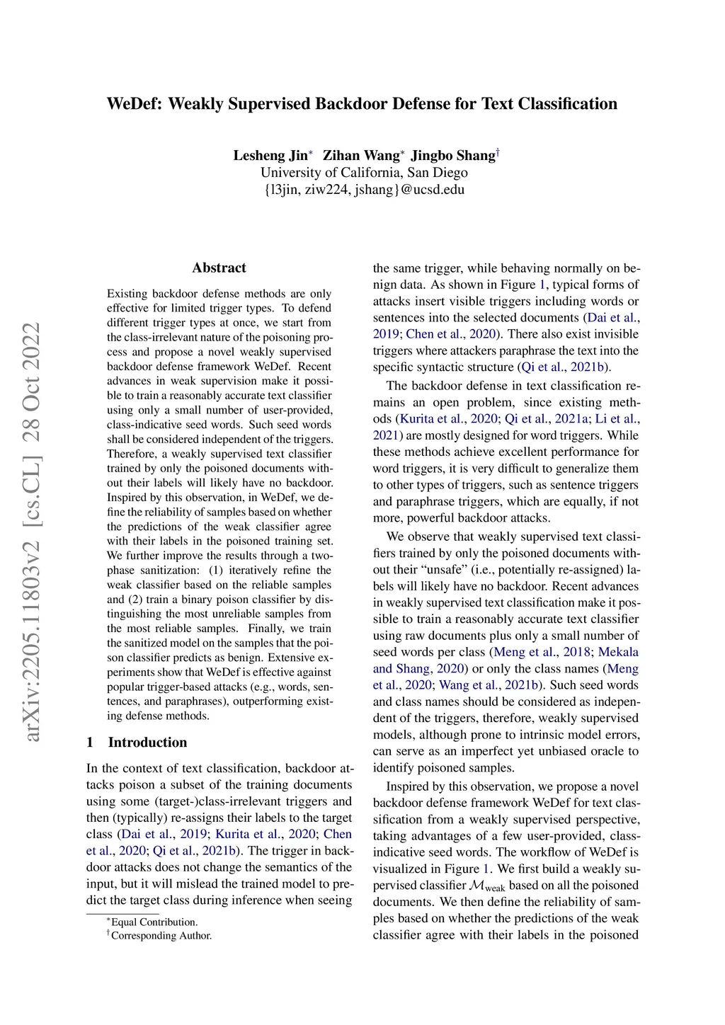 WeDef: Weakly Supervised Backdoor Defense for Text Classification
