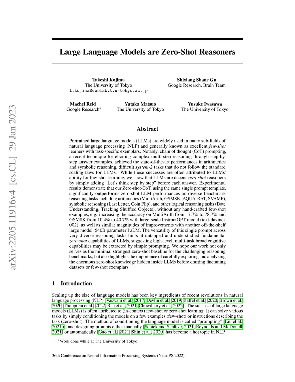 Pretrained large language models (LLMs) are widely used in many sub-fields of natural language processing (NLP) and generally known as excellent few-shot learners with task-specific exemplars. Notably, chain of thought (CoT) prompting, a recent technique for eliciting complex multi-step reasoning through step-by-step answer examples, achieved the state-of-the-art performances in arithmetics and symbolic reasoning, difficult system-2 tasks that do not follow the standard scaling laws for LLMs. While these successes are often attributed to LLMs' ability for few-shot learning, we show that LLMs are decent zero-shot reasoners by simply adding "Let's think step by step" before each answer. Experimental results demonstrate that our Zero-shot-CoT, using the same single prompt template, significantly outperforms zero-shot LLM performances on diverse benchmark reasoning tasks including arithmetics (MultiArith, GSM8K, AQUA-RAT, SVAMP), symbolic reasoning (Last Letter, Coin Flip), and other logical reasoning tasks (Date Understanding, Tracking Shuffled Objects), without any hand-crafted few-shot examples, e.g. increasing the accuracy on MultiArith from 17.7% to 78.7% and GSM8K from 10.4% to 40.7% with large InstructGPT model (text-davinci-002), as well as similar magnitudes of improvements with another off-the-shelf large model, 540B parameter PaLM. The versatility of this single prompt across very diverse reasoning tasks hints at untapped and understudied fundamental zero-shot capabilities of LLMs, suggesting high-level, multi-task broad cognitive capabilities may be extracted by simple prompting. We hope our work not only serves as the minimal strongest zero-shot baseline for the challenging reasoning benchmarks, but also highlights the importance of carefully exploring and analyzing the enormous zero-shot knowledge hidden inside LLMs before crafting finetuning datasets or few-shot exemplars.