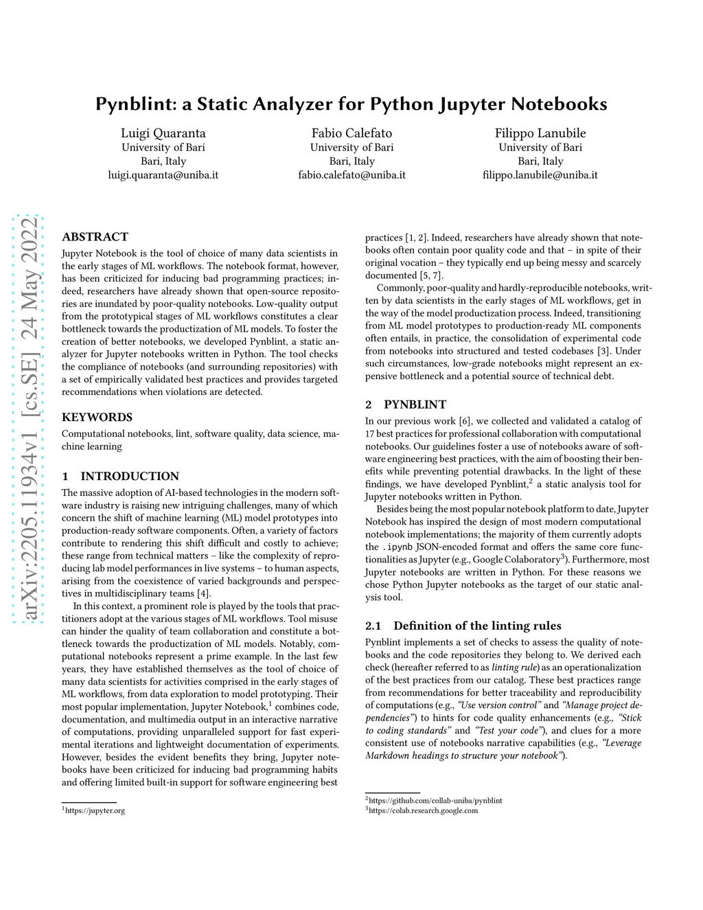 Pynblint: a Static Analyzer for Python Jupyter Notebooks