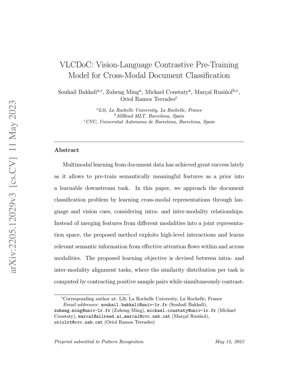 VLCDoC: Vision-Language Contrastive Pre-Training Model for Cross-Modal