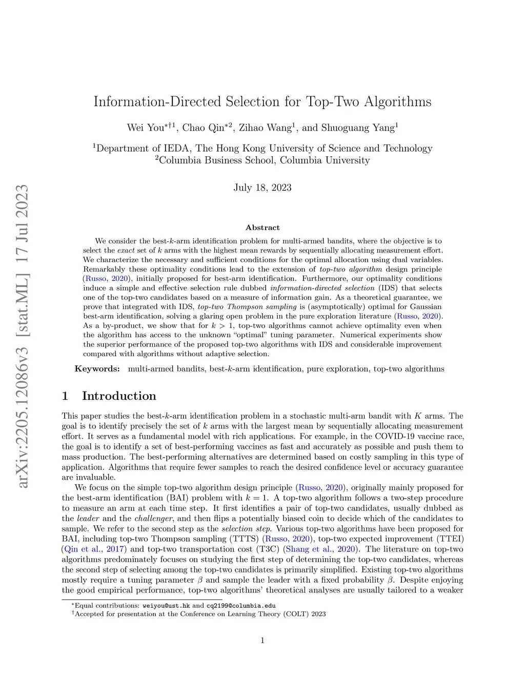 We consider the best-k-arm identification problem for multi-armed bandits, where the objective is to select the exact set of k arms with the highest mean rewards by sequentially allocating measurement effort. We characterize the necessary and sufficient conditions for the optimal allocation using dual variables. Remarkably these optimality conditions lead to the extension of top-two algorithm design principle (Russo, 2020), initially proposed for best-arm identification. Furthermore, our optimality conditions induce a simple and effective selection rule dubbed information-directed selection (IDS) that selects one of the top-two candidates based on a measure of information gain. As a theoretical guarantee, we prove that integrated with IDS, top-two Thompson sampling is (asymptotically) optimal for Gaussian best-arm identification, solving a glaring open problem in the pure exploration literature (Russo, 2020). As a by-product, we show that for k > 1, top-two algorithms cannot achieve optimality even with an oracle tuning parameter. Numerical experiments show the superior performance of the proposed top-two algorithms with IDS and considerable improvement compared with algorithms without adaptive selection.