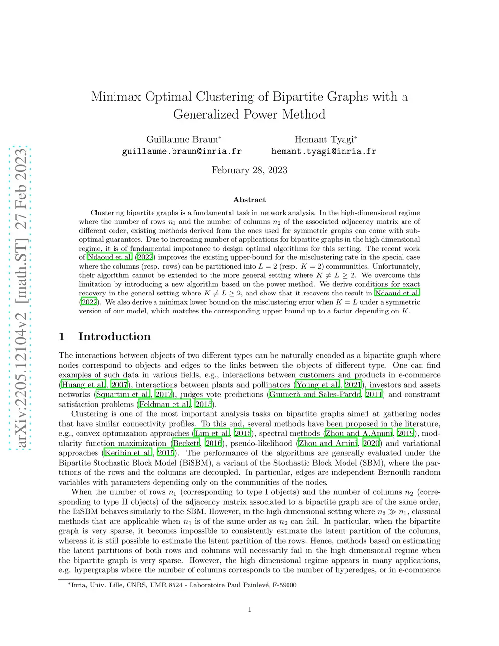 Clustering bipartite graphs is a fundamental task in network analysis. In the high-dimensional regime where the number of rows and the number of columns of the associated adjacency matrix are of different order, existing methods derived from the ones used for symmetric graphs can come with sub-optimal guarantees. Due to increasing number of applications for bipartite graphs in the high dimensional regime, it is of fundamental importance to design optimal algorithms for this setting. The recent work of Ndaoud et al. (2022) improves the existing upper-bound for the misclustering rate in the special case where the columns (resp. rows) can be partitioned into (resp. ) communities. Unfortunately, their algorithm cannot be extended to the more general setting where . We overcome this limitation by introducing a new algorithm based on the power method. We derive conditions for exact recovery in the general setting where , and show that it recovers the result in Ndaoud et al. (2022). We also derive a minimax lower bound on the misclustering error when under a symmetric version of our model, which matches the corresponding upper bound up to a factor depending on .