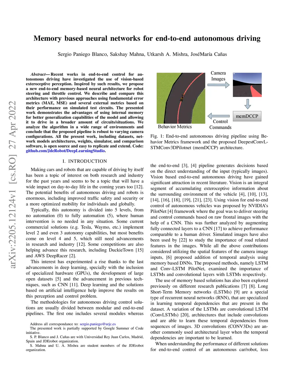 Recent works in end-to-end control for autonomous driving have investigated the use of vision-based exteroceptive perception. Inspired by such results, we propose a new end-to-end memory-based neural architecture for robot steering and throttle control. We describe and compare this architecture with previous approaches using fundamental error metrics (MAE, MSE) and several external metrics based on their performance on simulated test circuits. The presented work demonstrates the advantages of using internal memory for better generalization capabilities of the model and allowing it to drive in a broader amount of circuits/situations. We analyze the algorithm in a wide range of environments and conclude that the proposed pipeline is robust to varying camera configurations. All the present work, including datasets, network models architectures, weights, simulator, and comparison software, is open source and easy to replicate and extend.