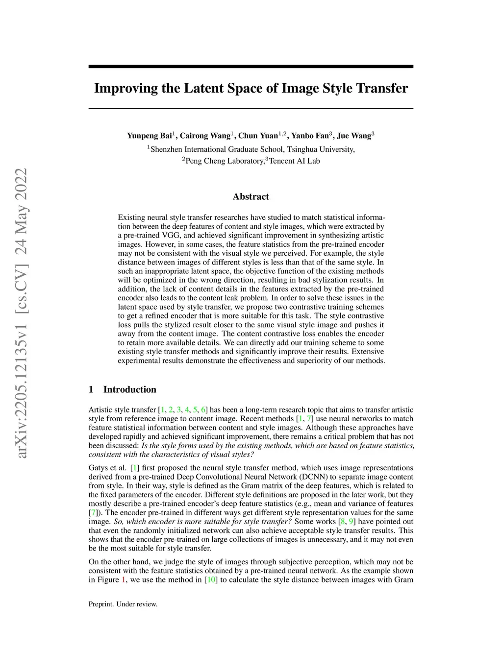 Existing neural style transfer researches have studied to match statistical information between the deep features of content and style images, which were extracted by a pre-trained VGG, and achieved significant improvement in synthesizing artistic images. However, in some cases, the feature statistics from the pre-trained encoder may not be consistent with the visual style we perceived. For example, the style distance between images of different styles is less than that of the same style. In such an inappropriate latent space, the objective function of the existing methods will be optimized in the wrong direction, resulting in bad stylization results. In addition, the lack of content details in the features extracted by the pre-trained encoder also leads to the content leak problem. In order to solve these issues in the latent space used by style transfer, we propose two contrastive training schemes to get a refined encoder that is more suitable for this task. The style contrastive loss pulls the stylized result closer to the same visual style image and pushes it away from the content image. The content contrastive loss enables the encoder to retain more available details. We can directly add our training scheme to some existing style transfer methods and significantly improve their results. Extensive experimental results demonstrate the effectiveness and superiority of our methods.