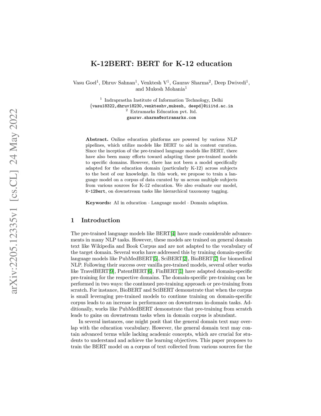 Online education platforms are powered by various NLP pipelines, which utilize models like BERT to aid in content curation. Since the inception of the pre-trained language models like BERT, there have also been many efforts toward adapting these pre-trained models to specific domains. However, there has not been a model specifically adapted for the education domain (particularly K-12) across subjects to the best of our knowledge. In this work, we propose to train a language model on a corpus of data curated by us across multiple subjects from various sources for K-12 education. We also evaluate our model, K12-BERT, on downstream tasks like hierarchical taxonomy tagging.