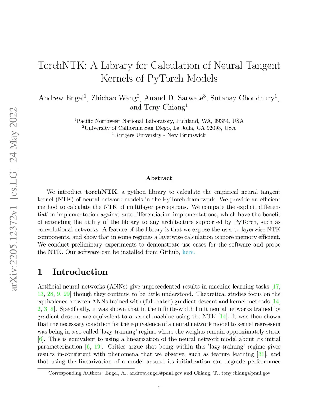 We introduce torchNTK, a python library to calculate the empirical neural tangent kernel (NTK) of neural network models in the PyTorch framework. We provide an efficient method to calculate the NTK of multilayer perceptrons. We compare the explicit differentiation implementation against autodifferentiation implementations, which have the benefit of extending the utility of the library to any architecture supported by PyTorch, such as convolutional networks. A feature of the library is that we expose the user to layerwise NTK components, and show that in some regimes a layerwise calculation is more memory efficient. We conduct preliminary experiments to demonstrate use cases for the software and probe the NTK.