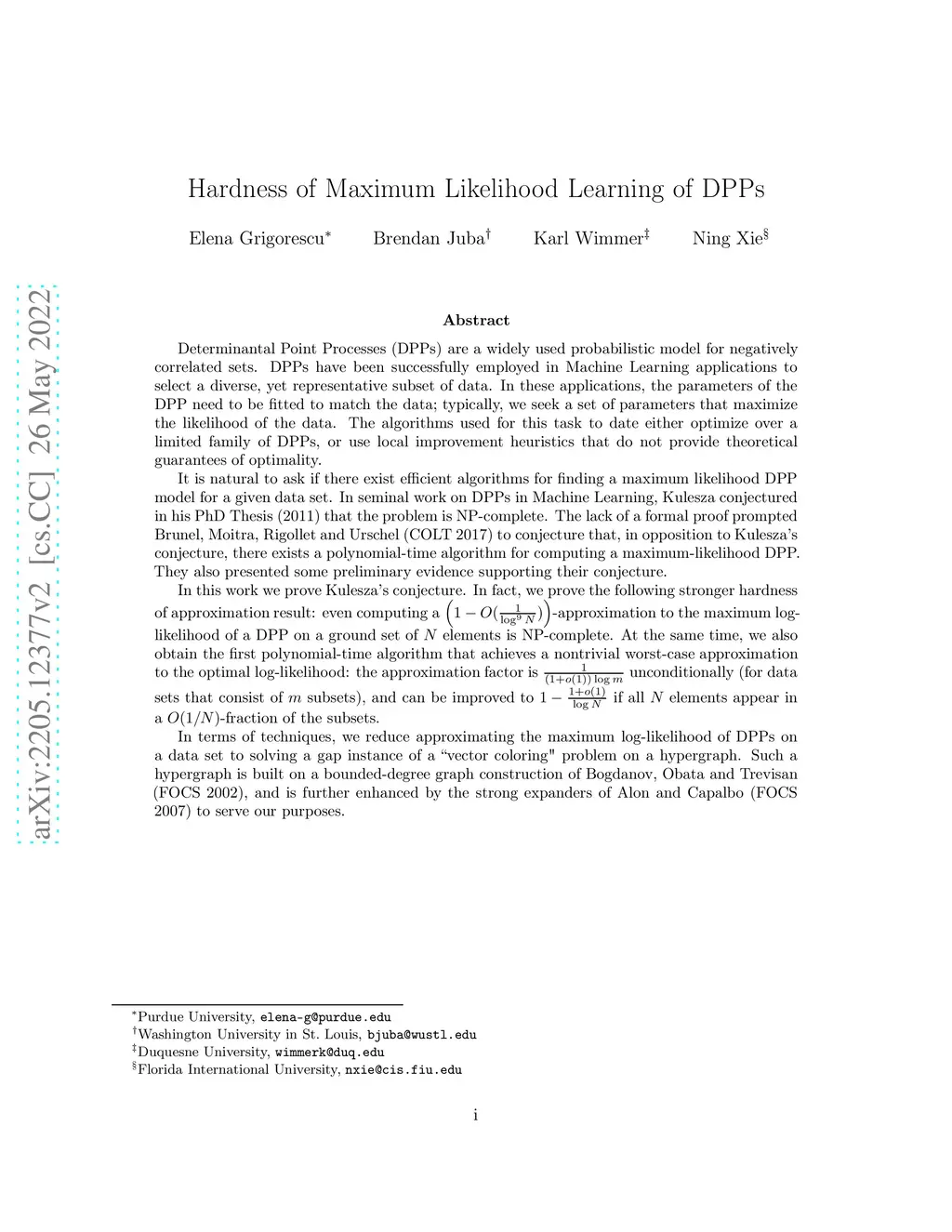 Determinantal Point Processes (DPPs) are a widely used probabilistic model for negatively correlated sets. DPPs have been successfully employed in Machine Learning applications to select a diverse, yet representative subset of data. In these applications, a set of parameters that maximize the likelihood of the data is typically desirable. The algorithms used for this task to date either optimize over a limited family of DPPs, or use local improvement heuristics that do not provide theoretical guarantees of optimality.In his seminal work on DPPs in Machine Learning, Kulesza (2011) conjectured that the problem is NP-complete. The lack of a formal proof prompted Brunel et al. (COLT 2017) to suggest that, in opposition to Kulesza's conjecture, there might exist a polynomial-time algorithm for computing a maximum-likelihood DPP. They also presented some preliminary evidence supporting a conjecture that they suggested might lead to such an algorithm.In this work we prove Kulesza's conjecture. In fact, we prove the following stronger hardness of approximation result: even computing a -approximation to the maximum log-likelihood of a DPP on a ground set of elements is NP-complete.From a technical perspective, we reduce the problem of approximating the maximum log-likelihood of a DPP to solving a gap instance of a \textsc{-Coloring} problem on a hypergraph. This hypergraph is based on the bounded-degree construction of Bogdanov et al. (FOCS 2002), which we enhance using the strong expanders of Alon and Capalbo (FOCS 2007). We demonstrate that if a rank- DPP achieves near-optimal log-likelihood, its marginal kernel must encode an almost perfect ``vector-coloring" of the hypergraph. Finally, we show that these continuous vectors can be decoded into a proper -coloring after removing a small fraction of ``noisy" edges.