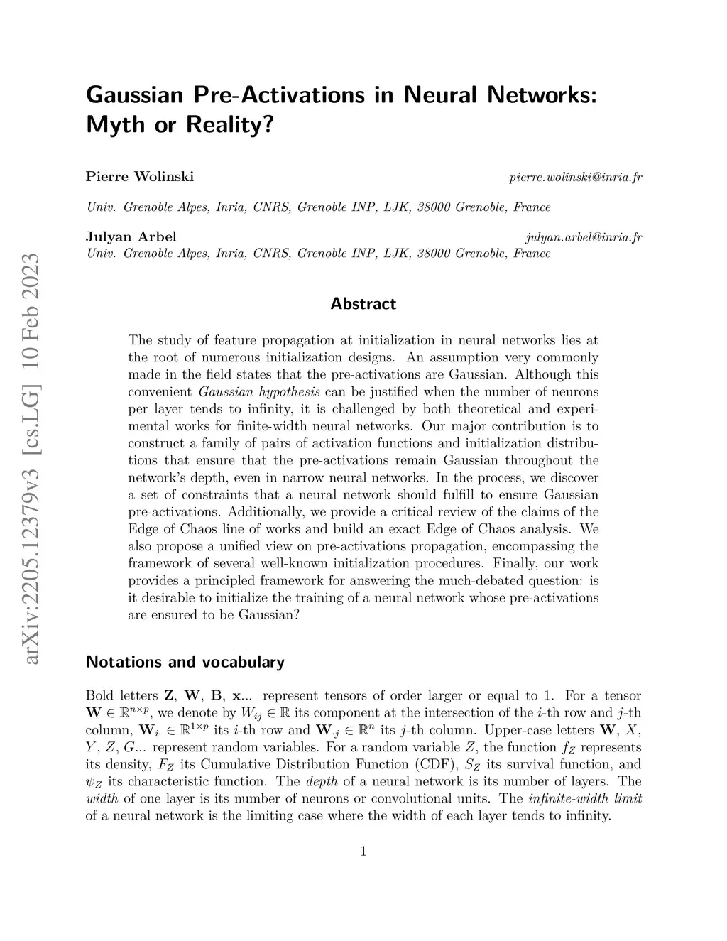 The study of feature propagation at initialization in neural networks lies at the root of numerous initialization designs. An assumption very commonly made in the field states that the pre-activations are Gaussian. Although this convenient Gaussian hypothesis can be justified when the number of neurons per layer tends to infinity, it is challenged by both theoretical and experimental works for finite-width neural networks. Our major contribution is to construct a family of pairs of activation functions and initialization distributions that ensure that the pre-activations remain Gaussian throughout the network's depth, even in narrow neural networks. In the process, we discover a set of constraints that a neural network should fulfill to ensure Gaussian pre-activations. Additionally, we provide a critical review of the claims of the Edge of Chaos line of works and build an exact Edge of Chaos analysis. We also propose a unified view on pre-activations propagation, encompassing the framework of several well-known initialization procedures. Finally, our work provides a principled framework for answering the much-debated question: is it desirable to initialize the training of a neural network whose pre-activations are ensured to be Gaussian? Our code is available on GitHub:this https URL.