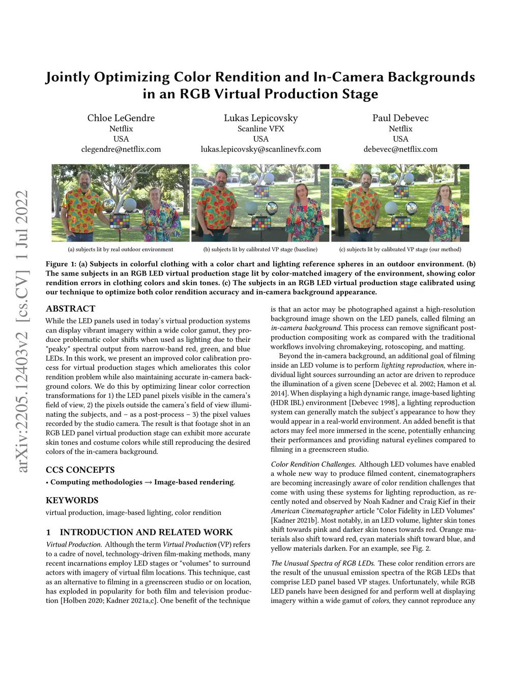 While the LED panels used in virtual production systems can display vibrant imagery with a wide color gamut, they produce problematic color shifts when used as lighting due to their peaky spectral output from narrow-band red, green, and blue LEDs. In this work, we present an improved color calibration process for virtual production stages which ameliorates this color rendition problem while also passing through accurate in-camera background colors. We do this by optimizing linear color correction transformations for 1) the LED panel pixels visible in the field of view of the camera, 2) the pixels outside the field of view of the camera illuminating the subjects, and, as a post-process, 3) the pixel values recorded by the camera. The result is that footage shot in an RGB LED panel virtual production stage can exhibit more accurate skin tones and costume colors while still reproducing the desired colors of the in-camera background.