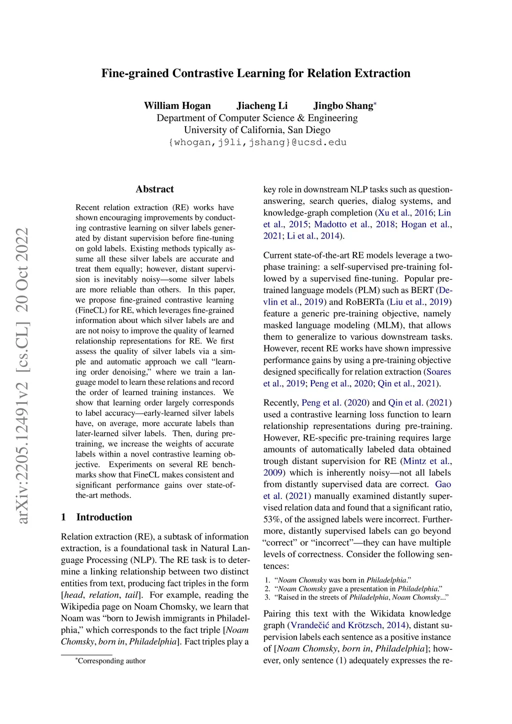 Recent relation extraction (RE) works have shown encouraging improvements by conducting contrastive learning on silver labels generated by distant supervision before fine-tuning on gold labels. Existing methods typically assume all these silver labels are accurate and treat them equally; however, distant supervision is inevitably noisy -- some silver labels are more reliable than others. In this paper, we propose fine-grained contrastive learning (FineCL) for RE, which leverages fine-grained information about which silver labels are and are not noisy to improve the quality of learned relationship representations for RE. We first assess the quality of silver labels via a simple and automatic approach we call "learning order denoising," where we train a language model to learn these relations and record the order of learned training instances. We show that learning order largely corresponds to label accuracy -- early-learned silver labels have, on average, more accurate labels than later-learned silver labels. Then, during pre-training, we increase the weights of accurate labels within a novel contrastive learning objective. Experiments on several RE benchmarks show that FineCL makes consistent and significant performance gains over state-of-the-art methods.