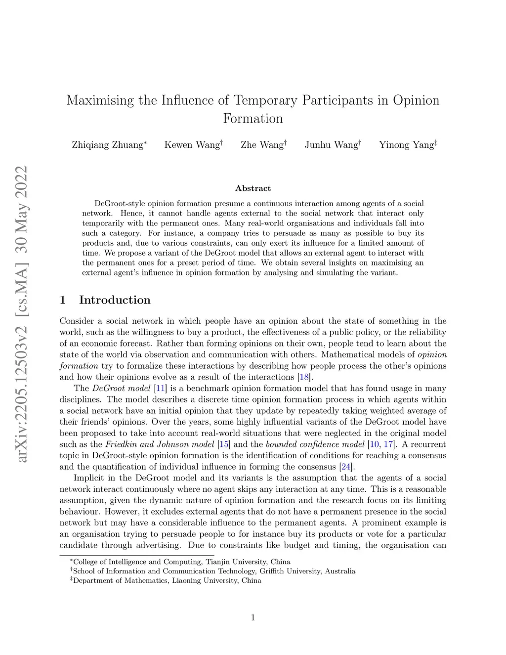 DeGroot-style opinion formation presumes a continuous interaction among agents of a social network. Hence, it cannot handle agents external to the social network that interact only temporarily with the permanent ones. Many real-world organisations and individuals fall into such a category. For instance, a company tries to persuade as many as possible to buy its products and, due to various constraints, can only exert its influence for a limited amount of time. We propose a variant of the DeGroot model that allows an external agent to interact with the permanent ones for a preset period of time. We obtain several insights on maximising an external agent's influence in opinion formation by analysing and simulating the variant.