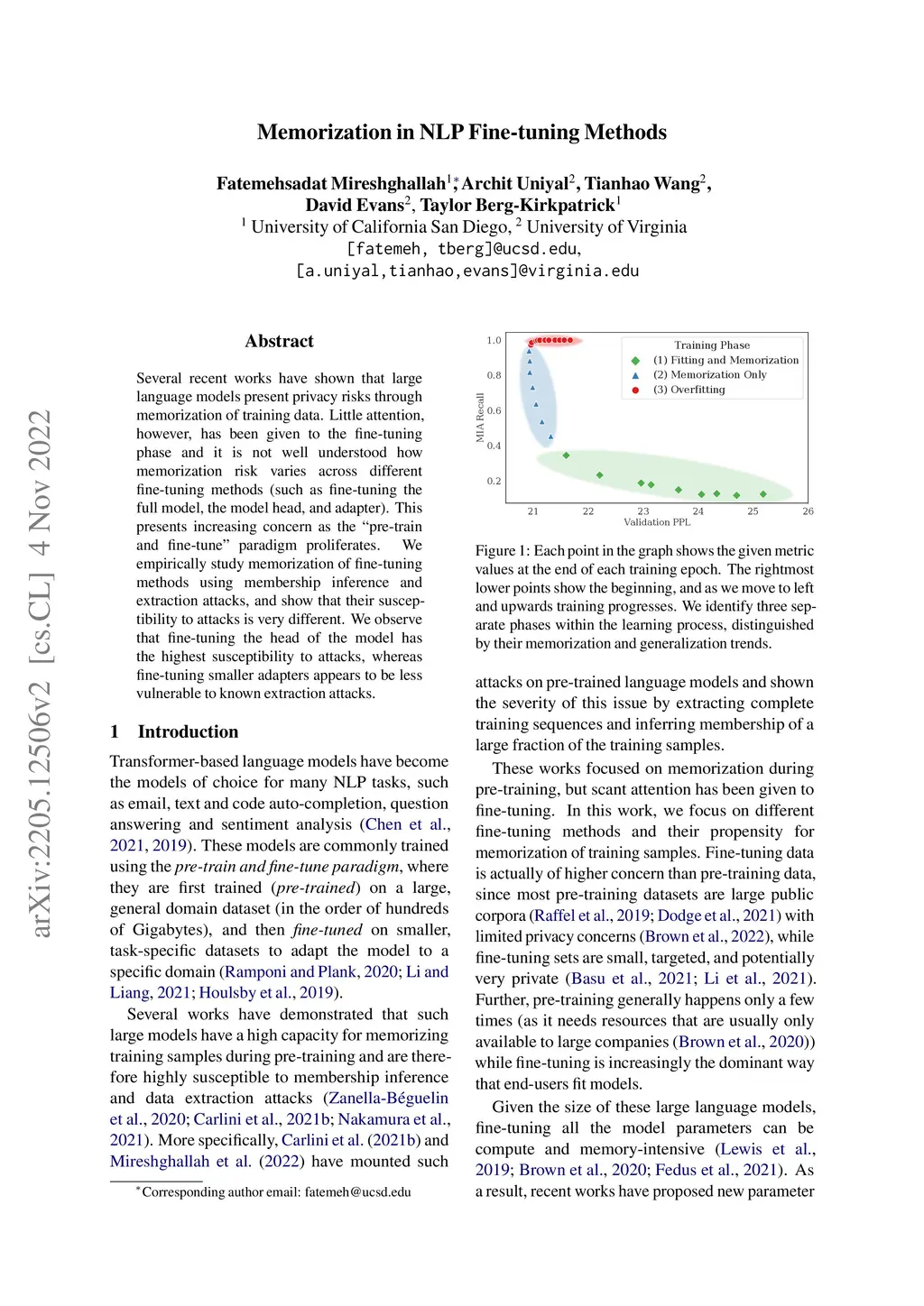 Large language models are shown to present privacy risks through memorization of training data, and several recent works have studied such risks for the pre-training phase. Little attention, however, has been given to the fine-tuning phase and it is not well understood how different fine-tuning methods (such as fine-tuning the full model, the model head, and adapter) compare in terms of memorization risk. This presents increasing concern as the "pre-train and fine-tune" paradigm proliferates. In this paper, we empirically study memorization of fine-tuning methods using membership inference and extraction attacks, and show that their susceptibility to attacks is very different. We observe that fine-tuning the head of the model has the highest susceptibility to attacks, whereas fine-tuning smaller adapters appears to be less vulnerable to known extraction attacks.