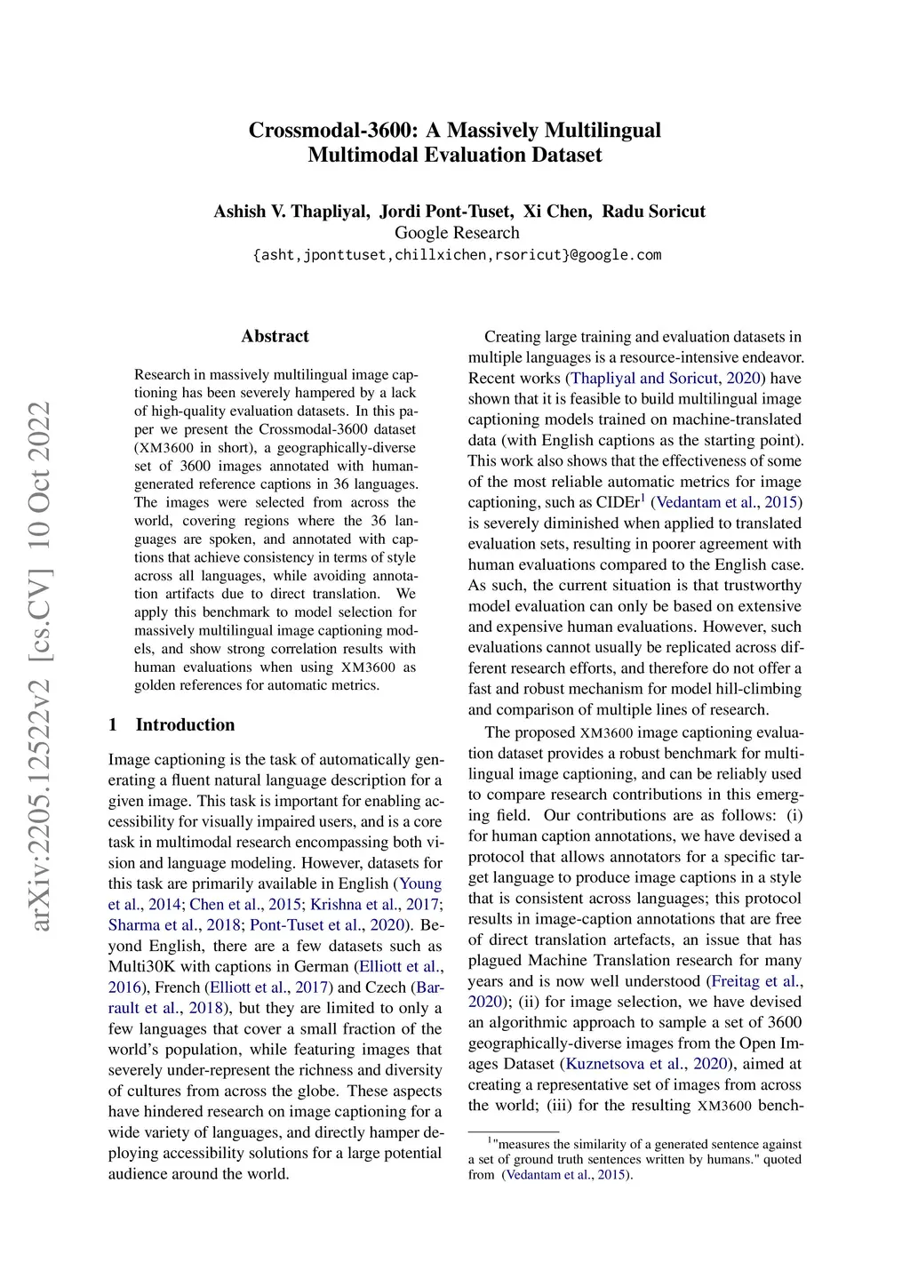 Research in massively multilingual image captioning has been severely hampered by a lack of high-quality evaluation datasets. In this paper we present the Crossmodal-3600 dataset (XM3600 in short), a geographically diverse set of 3600 images annotated with human-generated reference captions in 36 languages. The images were selected from across the world, covering regions where the 36 languages are spoken, and annotated with captions that achieve consistency in terms of style across all languages, while avoiding annotation artifacts due to direct translation. We apply this benchmark to model selection for massively multilingual image captioning models, and show superior correlation results with human evaluations when using XM3600 as golden references for automatic metrics.