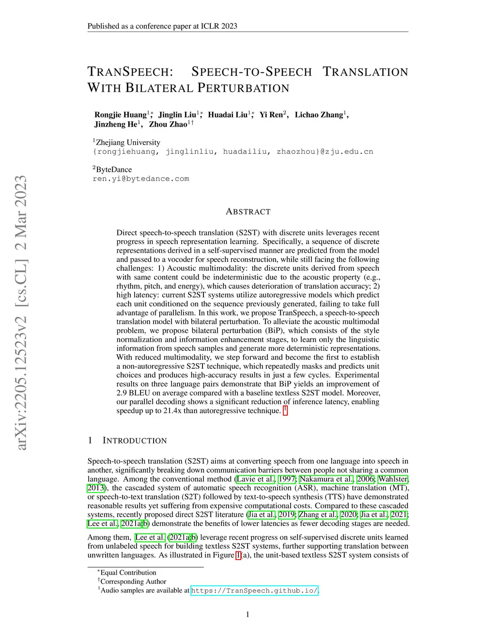 TranSpeech: Speech-to-Speech Translation With Bilateral Perturbation